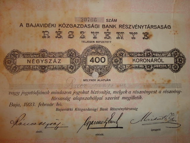 Aktie: 1923. Aktie von "Bajavidéki Közgazdasági Bank Részvénytársaság" über 400 Korona.