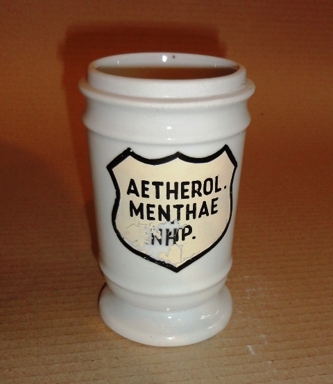 Aphoteker Tiegel 3.: Anfang des 20. Jahrhunderts. Porzellan ohne deckel. Auf der Vorderseite Inschrift: AETHEROL MENTHAE NHP. Größe: 12,5 cm hoch, d=7,5 cm