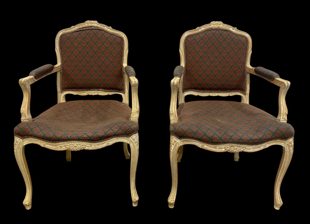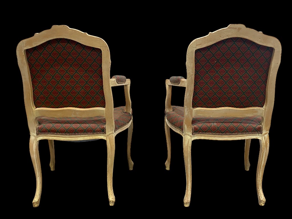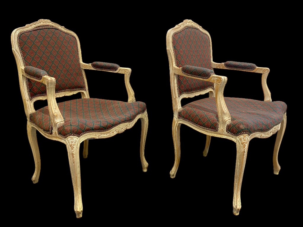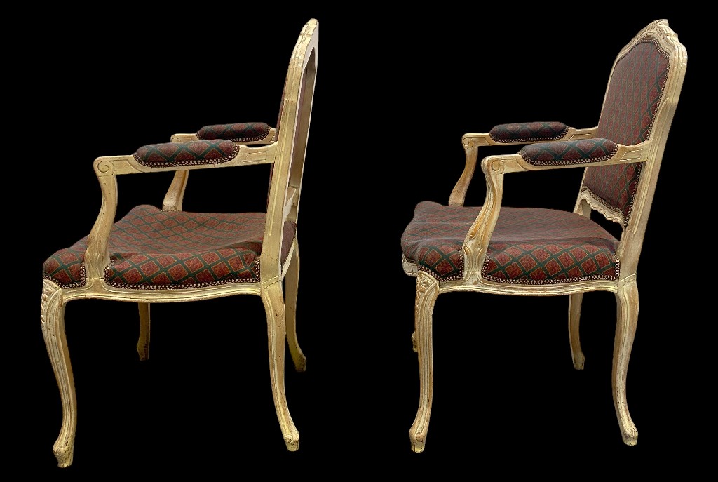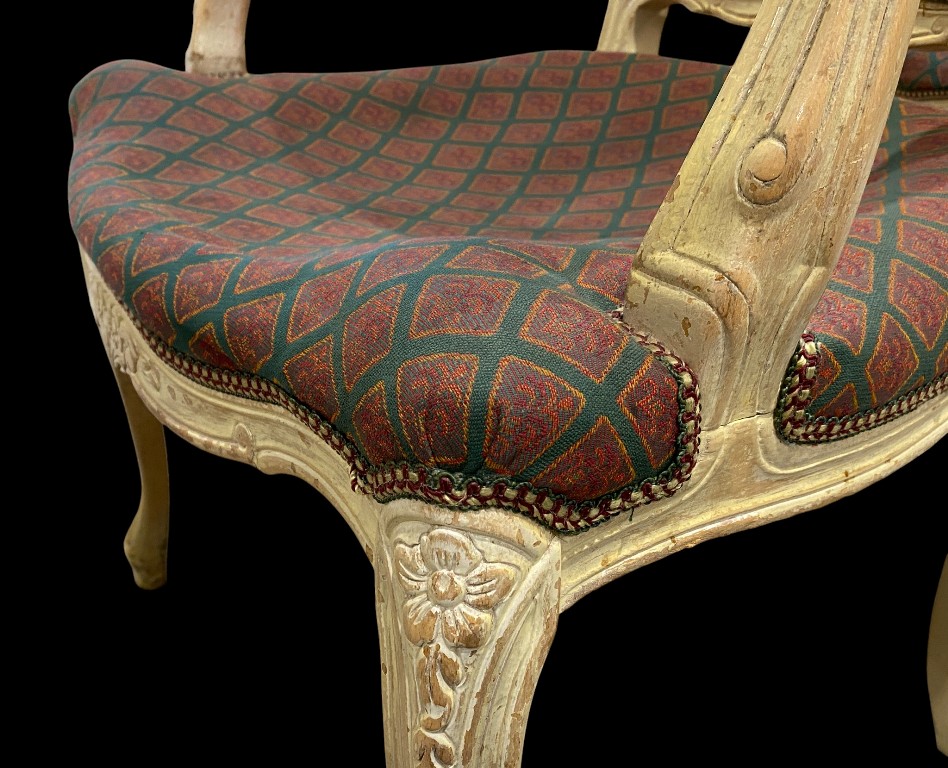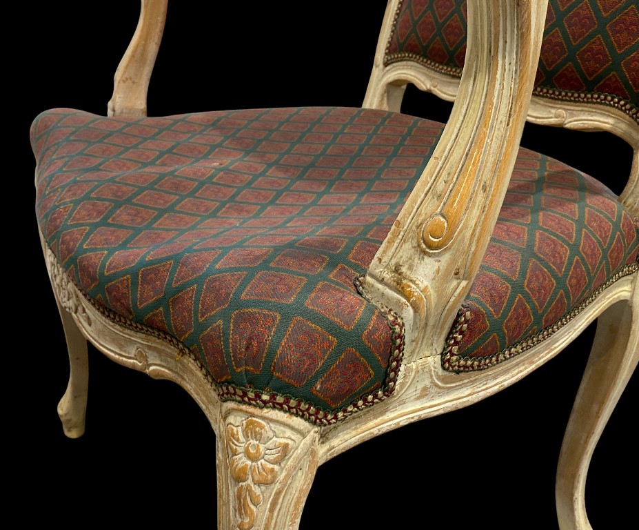 Armlehnenstuhl im Barockstil mit burgundgrün gemustertem Bezug