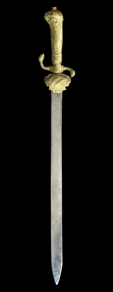 Mitte 18. Jahrhundert. Österreich, Deutschland oder Ungarn. Gegossener Messinggriff mit gedrehter Verzierung und Löwenkopfabschluss, mit doppelt geschwungener Parierstange. Schmale, gerade Klinge mit geätztem Dekor. Lateinische Inschrift: „Wehe mir, wie schrecklich…“. Ohne Scheide, guter Zustand.