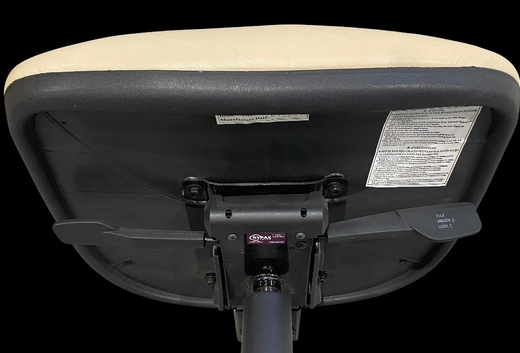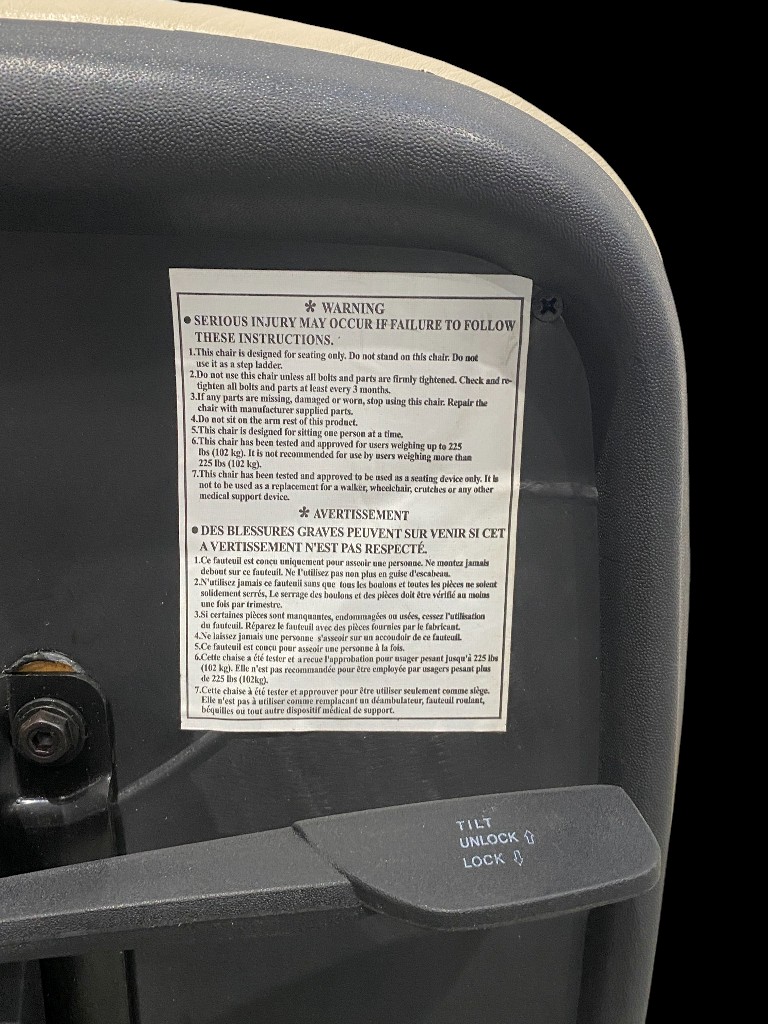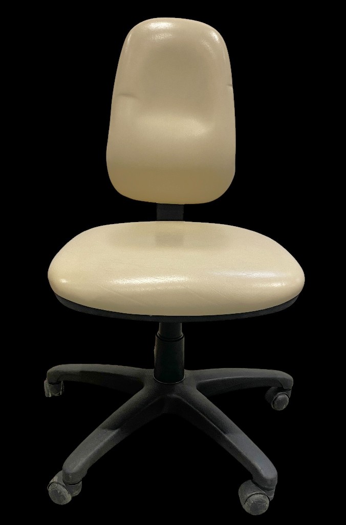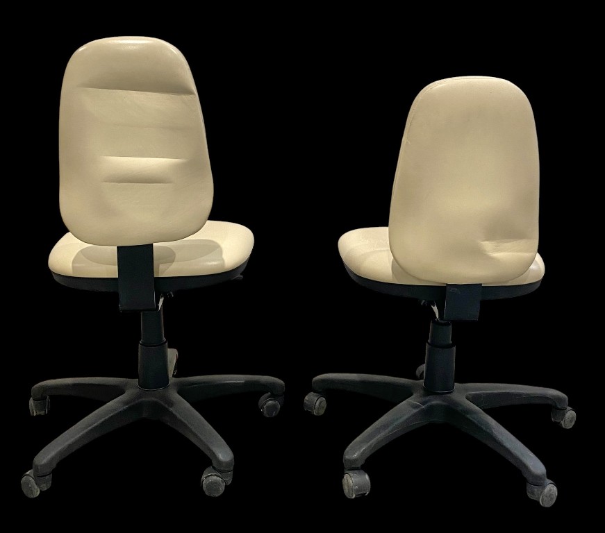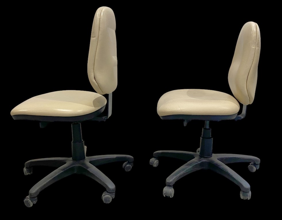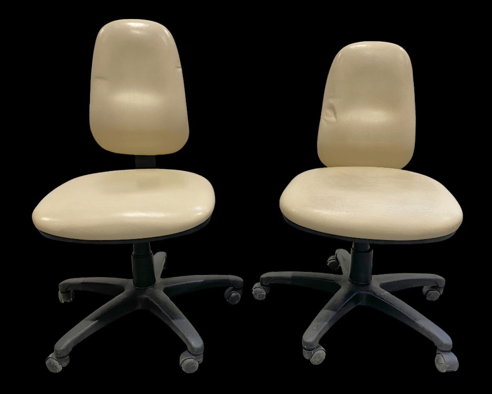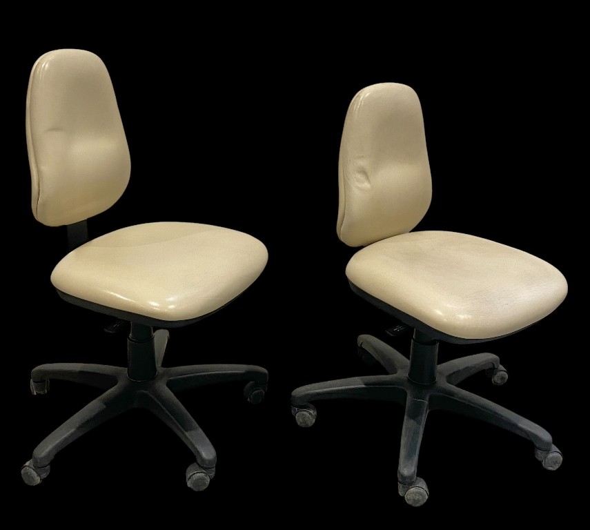 Stahl- und Kunststoffgestell mit cremefarbenem Kunstlederbezug. Gebraucht, guter Zustand, bei 2 Stücken ist die Rückenlehne abgefallen, 1 Stück hat fehlende Rolle am Fuß.