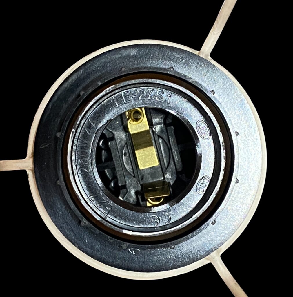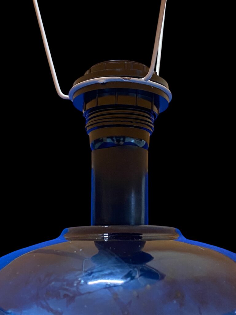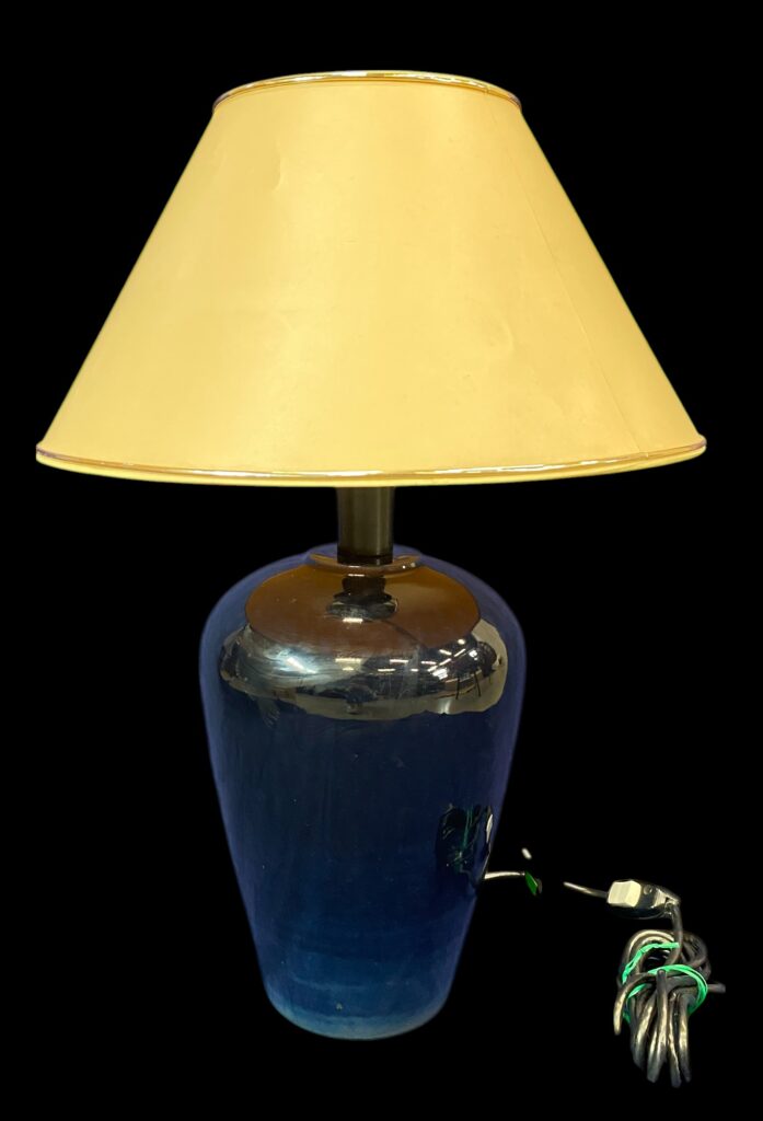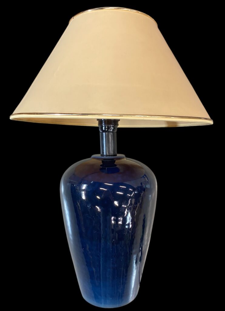 Blaue vasenförmige Tischleuchte 53 cm: Körper aus hochglänzendem Porzellan in Ecru mit Papierschirm. Hochglänzender Glasschirm mit Papier-Leuchtkörper. Ohne Glühbirne.