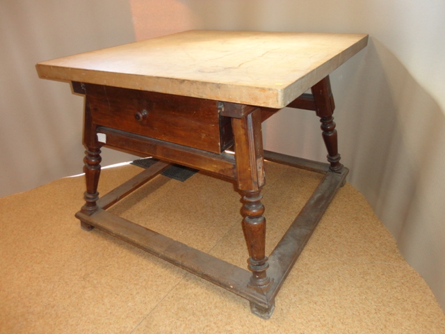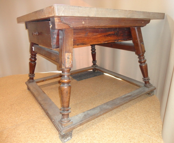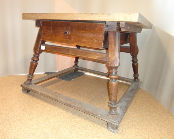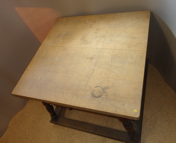 Bock Tisch: Größe: 77 cm hoch, Tischplatte 100x9,5 cm, bei den Beinen 102x102 cm