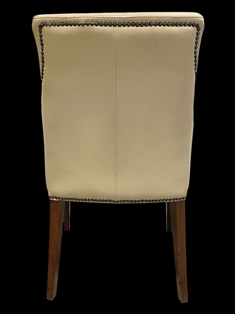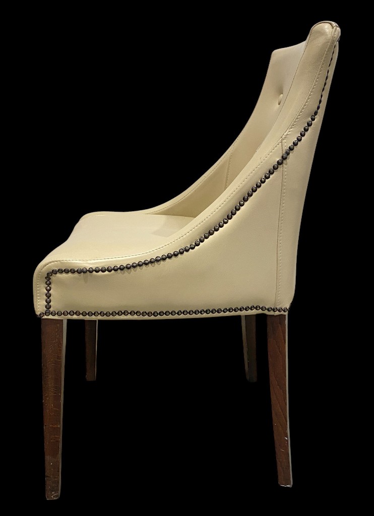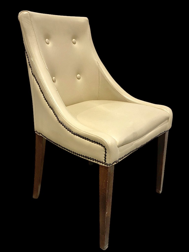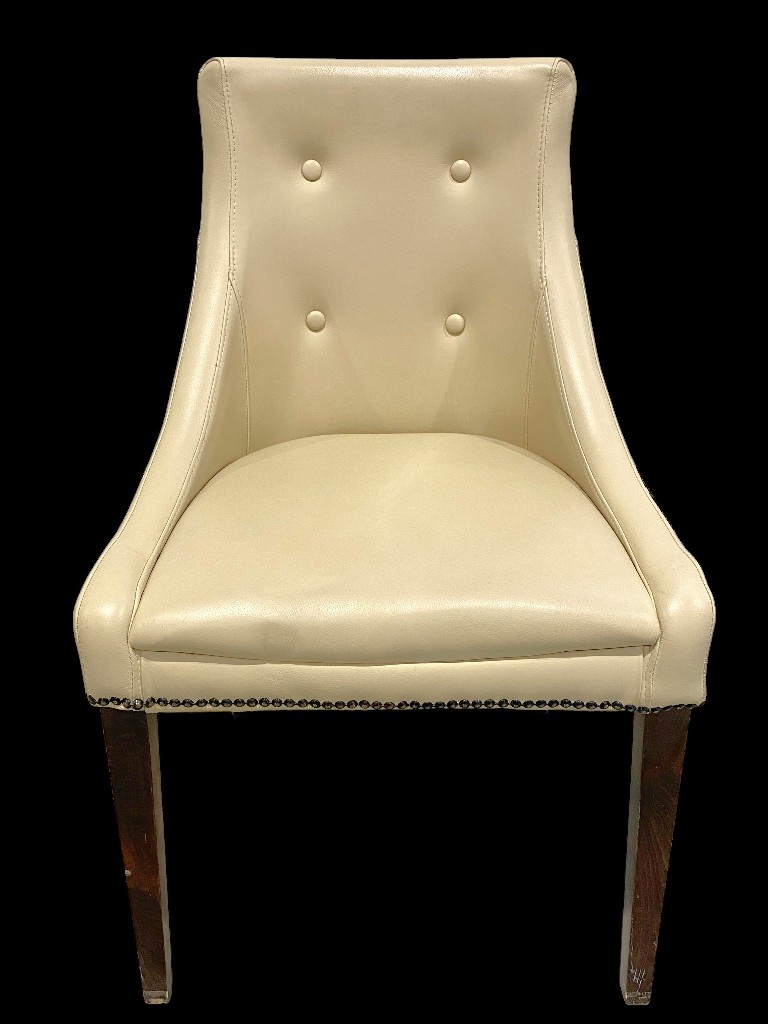 Auf lackiertem braunen Holzgestell, mit cremefarbener Kunstlederpolsterung, 4 Knopfheftungen an der Rückenlehne. Gebraucht, in gutem Zustand.