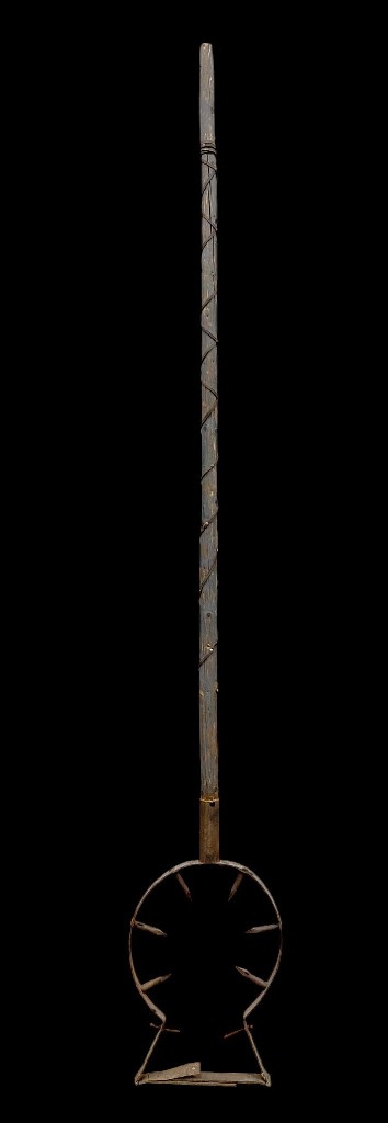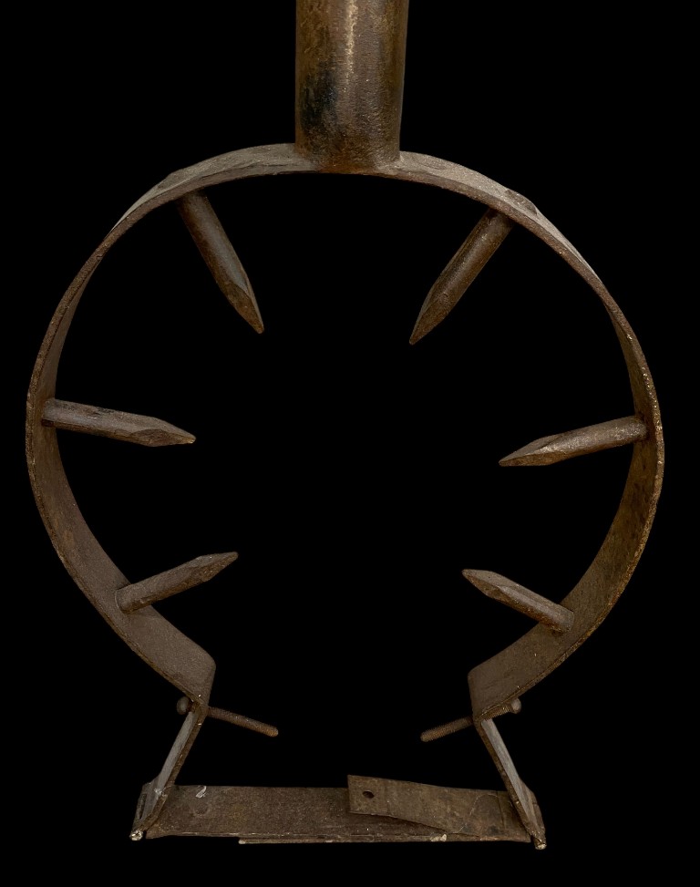 Auf Holzstange befestigte Stahlplatte mit Dornen. Guter Zustand.