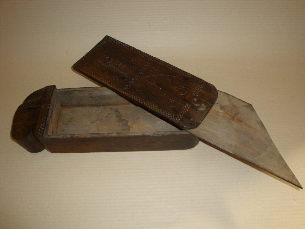 Extra großes Rasiermesseretui: Datiert 1916, mit geschnitzter Verzierung, mit verschteckter Öffnung. Sein Besonderheit besteht aus der extra Größe. Original, gereinigter Zustand mit Wachs behandelte Oberfläche.