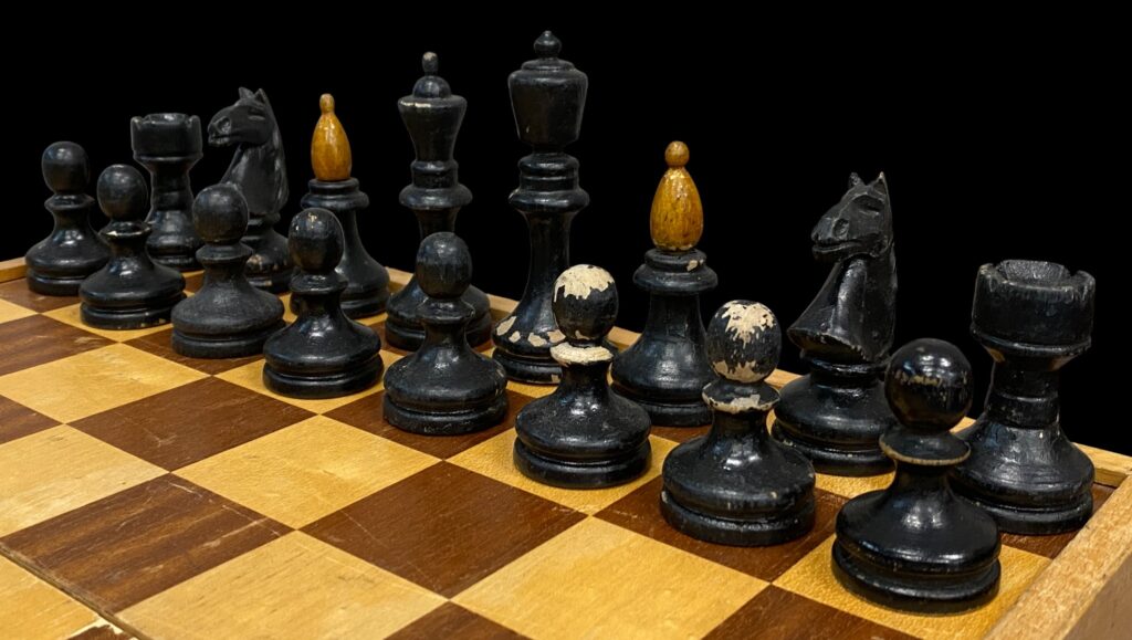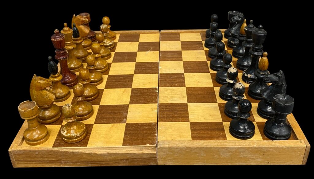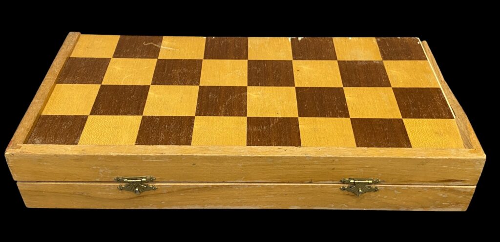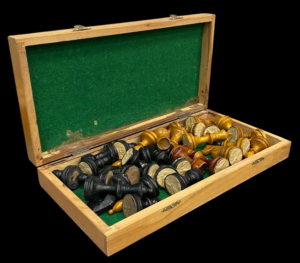 Mit Nussbaum- und Ahornintarsienoberfläche und gedrechselten Holzfiguren. In gutem Zustand, jedoch mit abgespaltener Brettkante. Innen mit grünem Filz ausgekleidet.