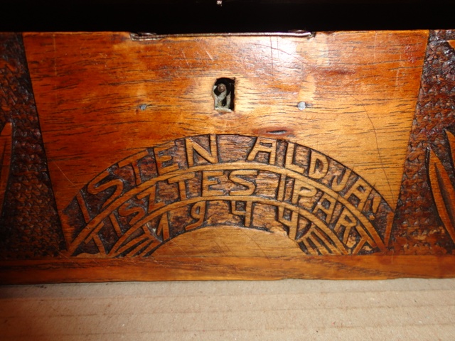 Geschnitzte Kiste 1944: original, gereinigter Zustand. Auf der Vorderseite Inschrift: "ISTEN ÁLDJA TISZTES IPART 1944."