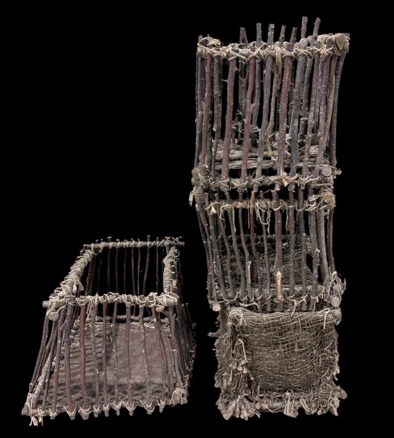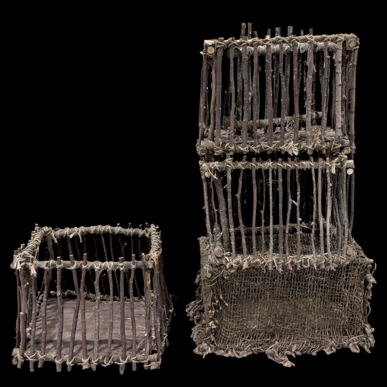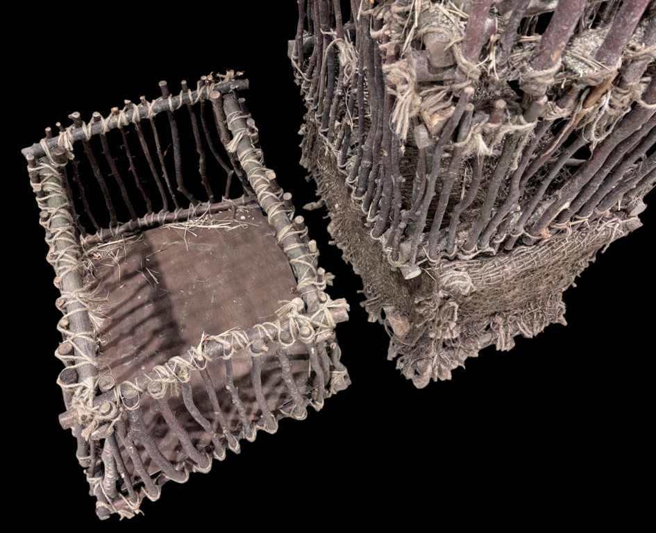 Aus Holzästen gebaut mit Schnurbefestigung, teilweise mit Hanfnetz. In gutem Zustand.