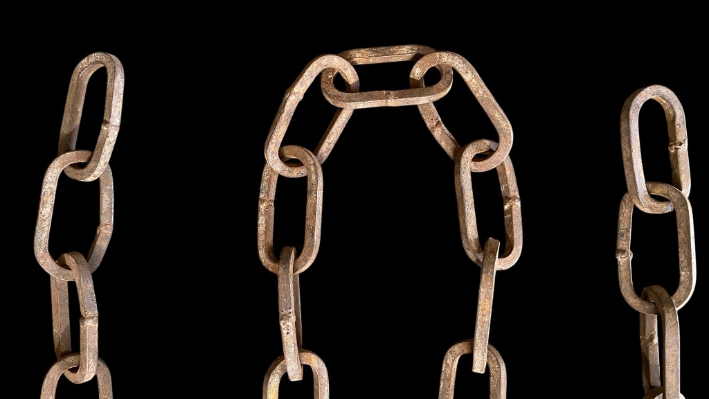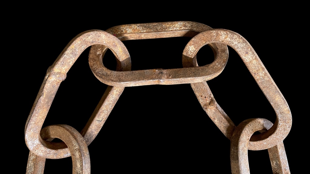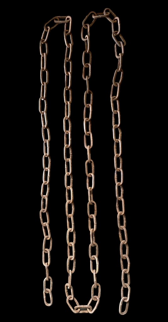 Patinierter Stahl. In gutem Zustand. Maße: Kettenglied 13 cm x 1,2 cm
