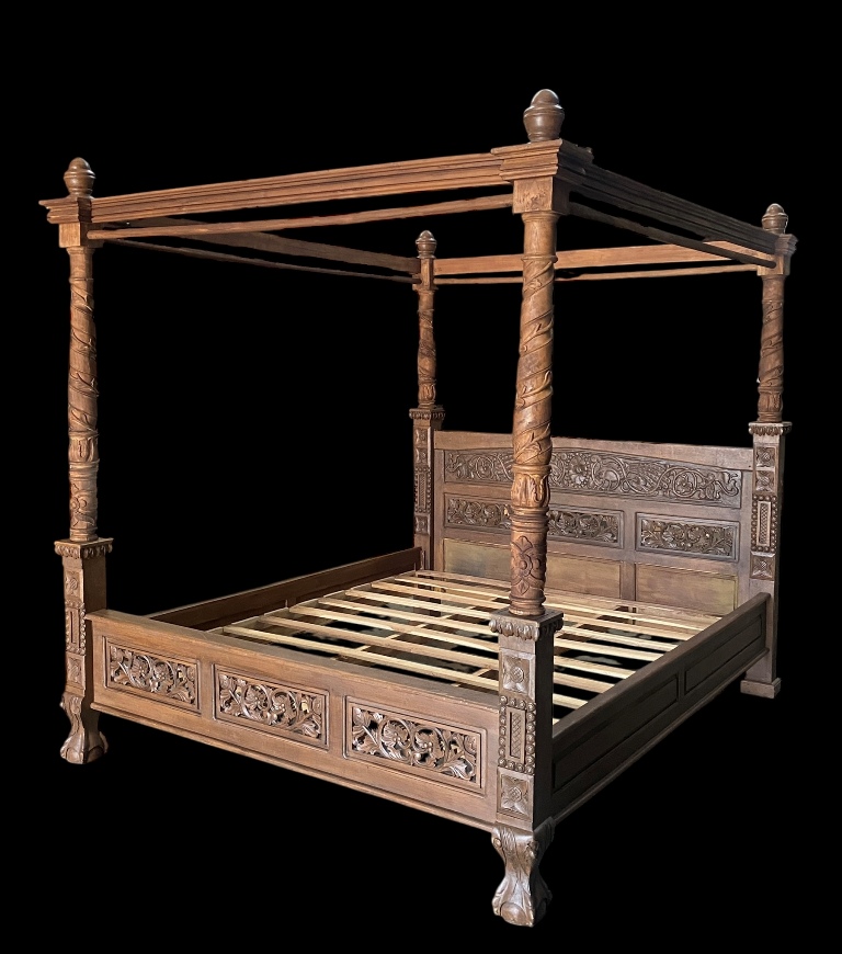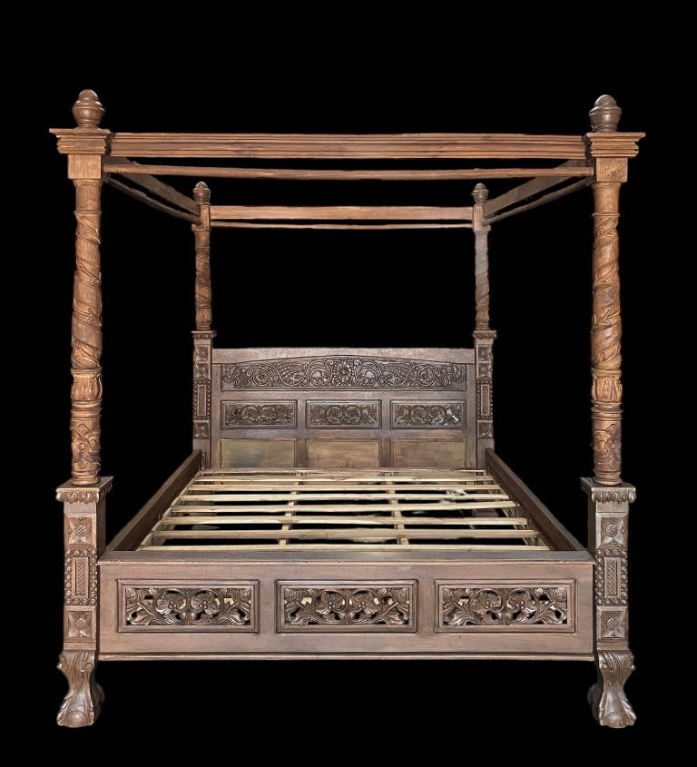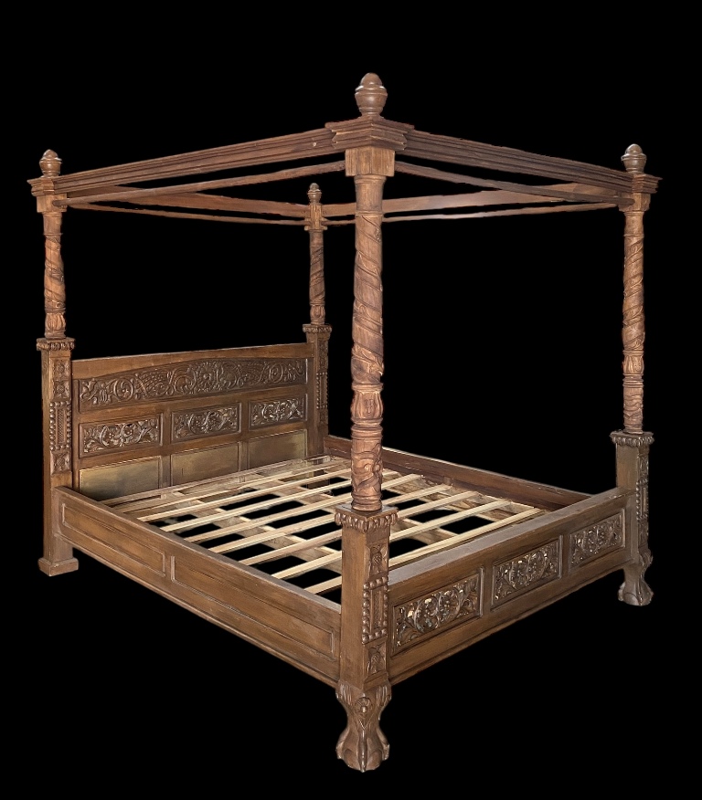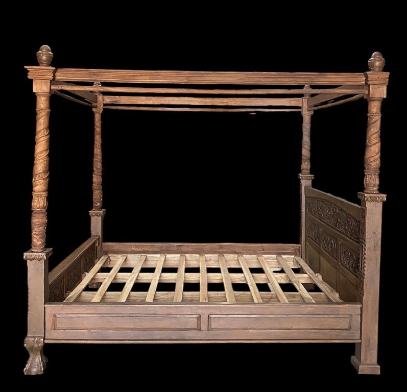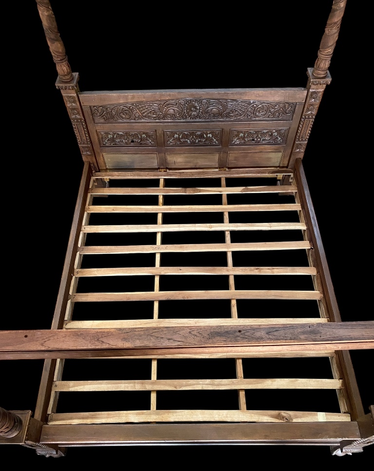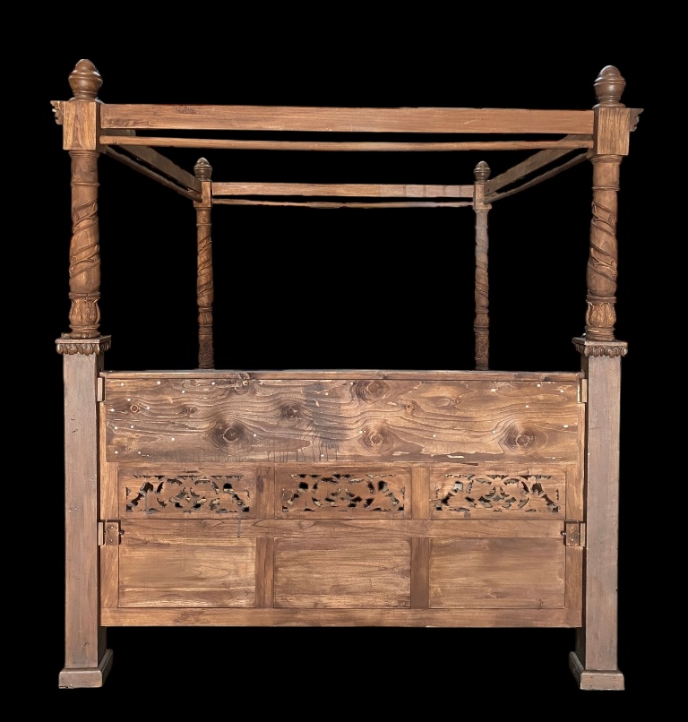 Ende 20. Jahrhundert. Geschnitztes und gemeißeltes Holz. Oberfläche gebeizt. Säulen laut Abbildung abnehmbar, auch ohne Baldachinrahmen nutzbar. Mit Lattenrost.