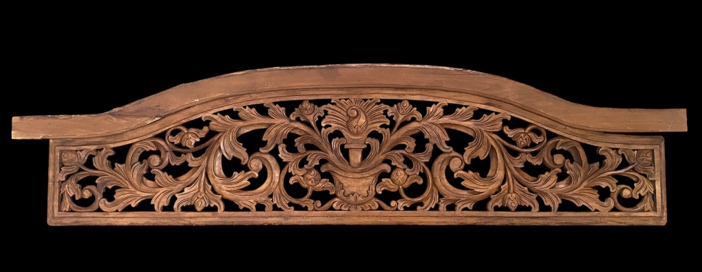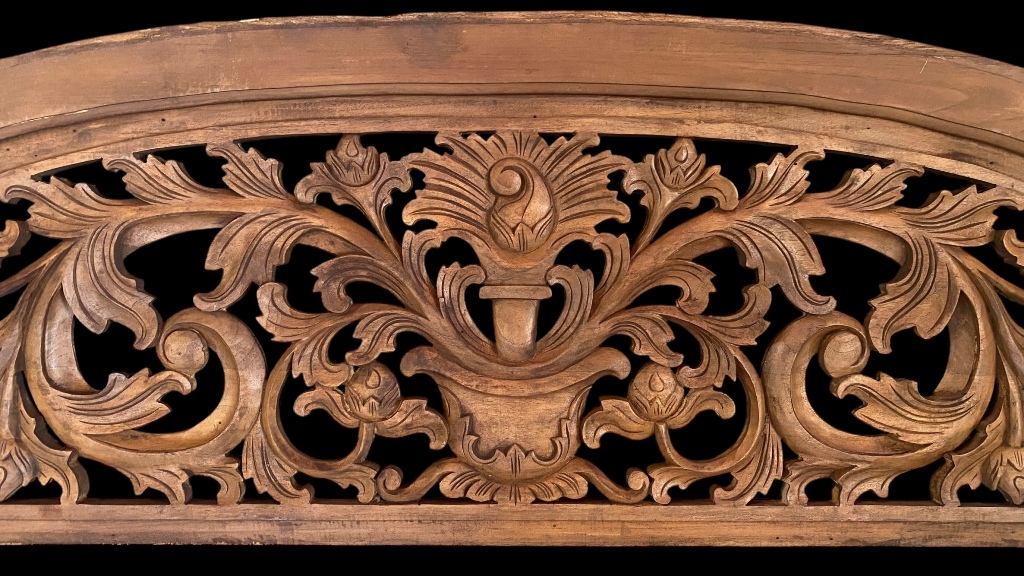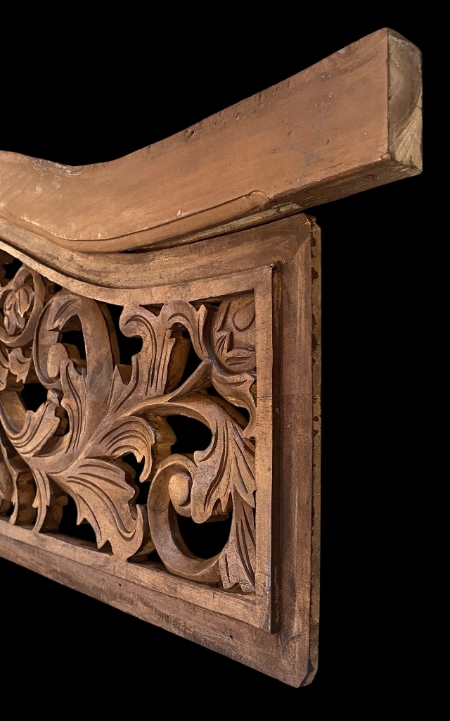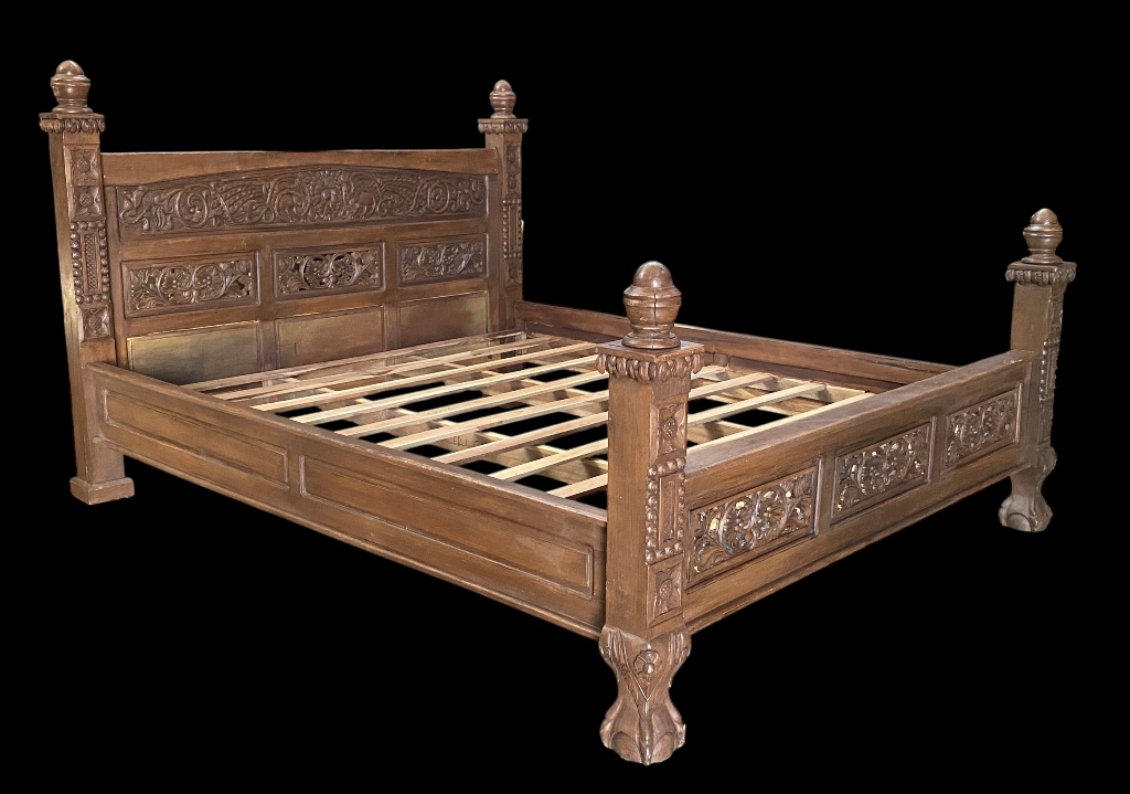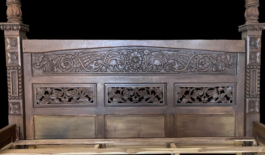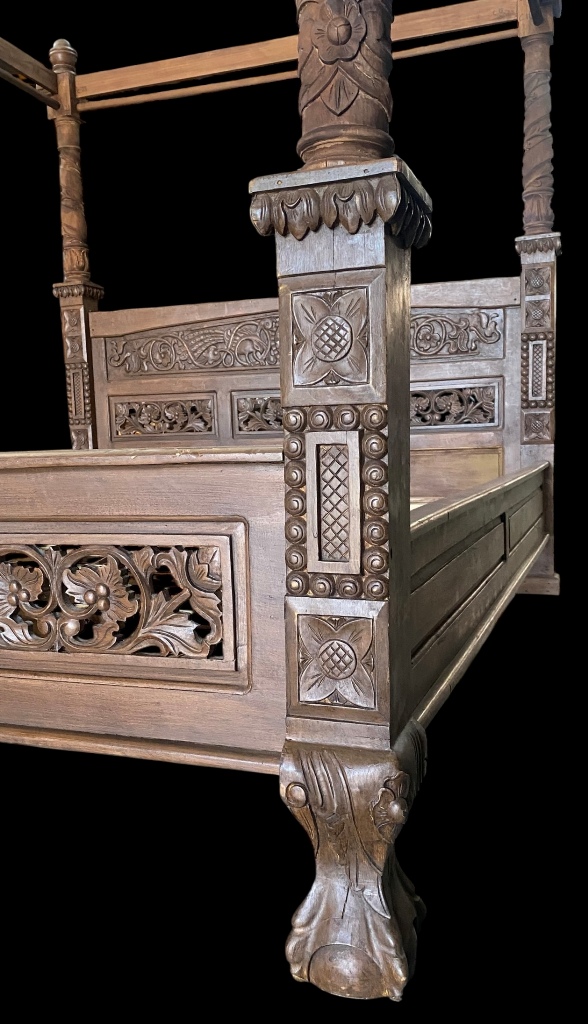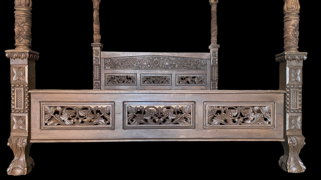 Ende 20. Jahrhundert. Geschnitztes und gemeißeltes Holz. Oberfläche gebeizt. Säulen laut Abbildung abnehmbar, auch ohne Baldachinrahmen nutzbar. Mit Lattenrost.