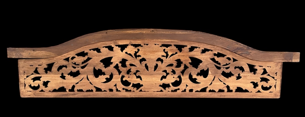 Größe: komplett 217 x 201 x 237 cm; Matratze: 210-220 x 180 cm, Dicke mind. 12 cm; Vom Bettboden bis zur Oberkante des Kopfteils: 76 cm; Bett ohne Baldachinteil: 135 x 195 x 237 cm; Gebogene durchbrochene Schnitzerei: 42 cm hoch, Querleiste 173 cm, Schnitzerei 159 cm
