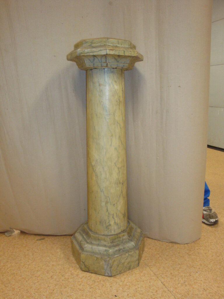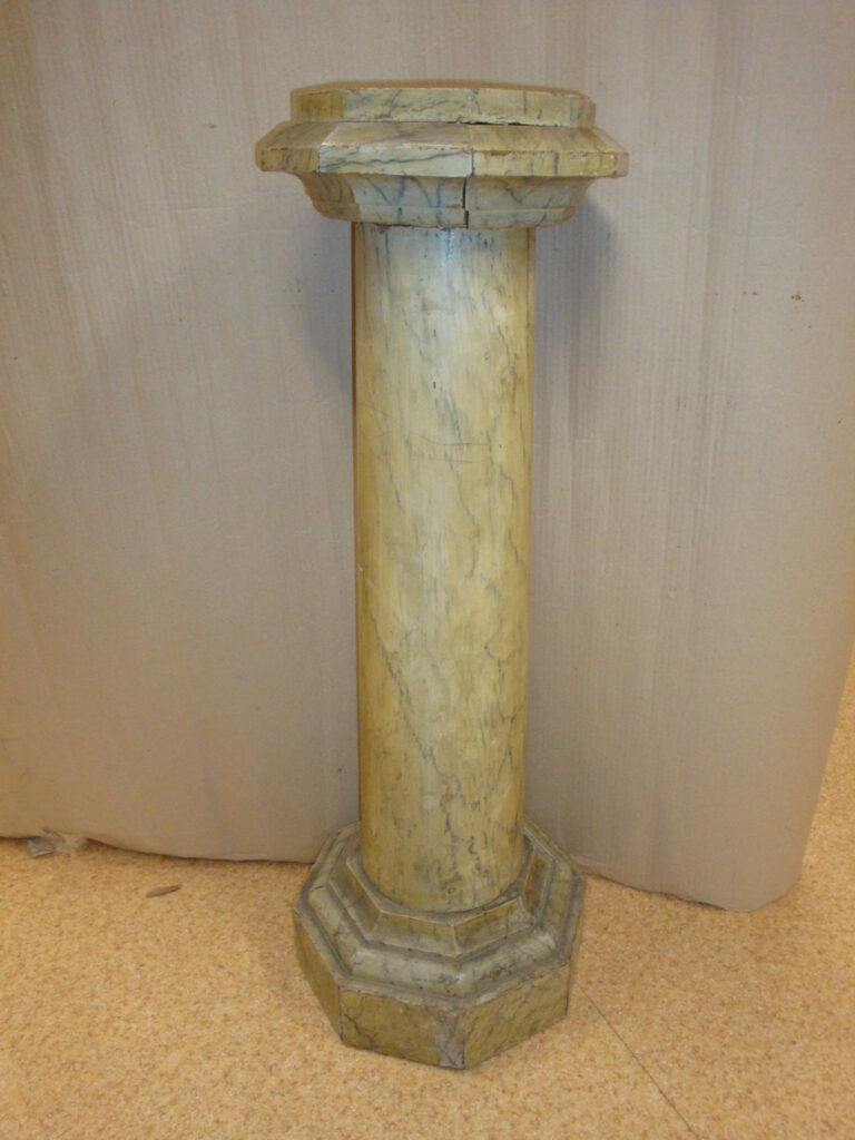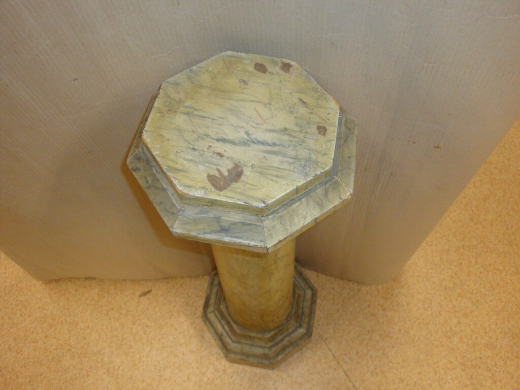 Holz Postament: Ende des 19. und Anfang des 20. Jahrhundertes. Mit Marmor Nachbildung Platte, mit achteckigem Sockel und Platte. Größe: h=98 cm, d=35 cm