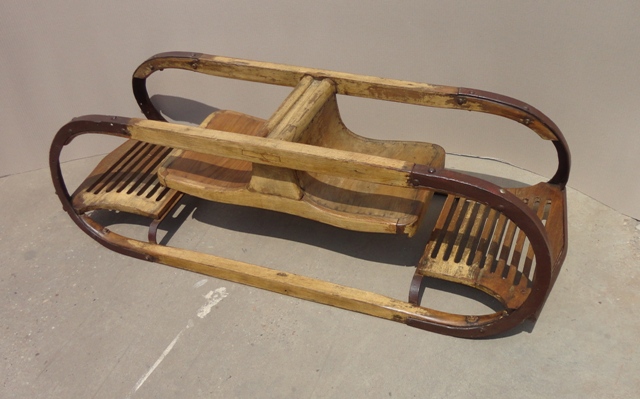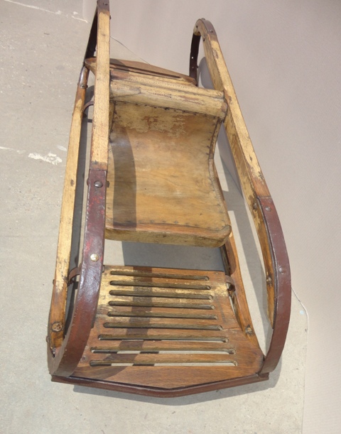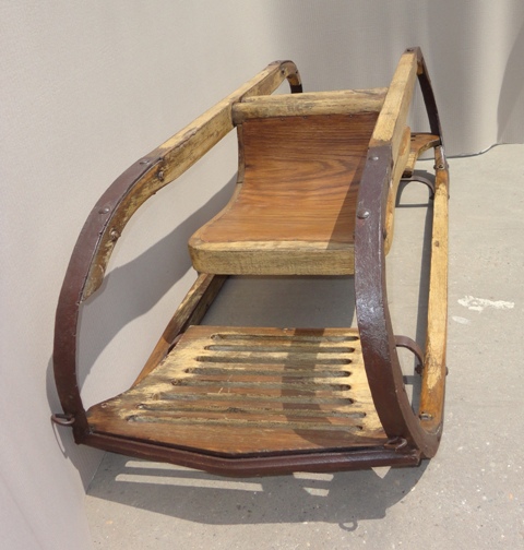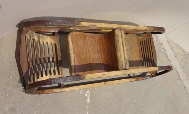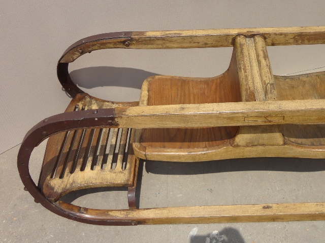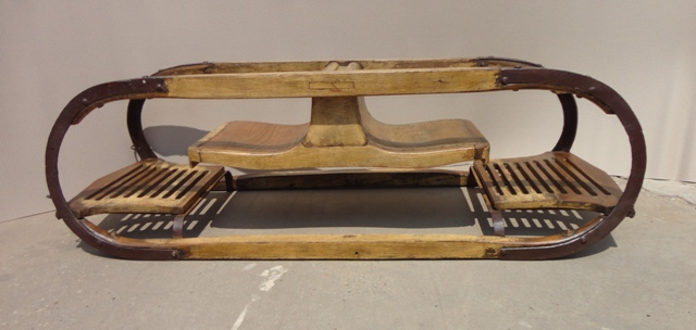 Holz Schlitten: um 1920. Korpus aus Hartholz mit Eisen beschlagen. Die 2 Sitze können gegenüber gestellt werden. Seltenes Sammlerstück.