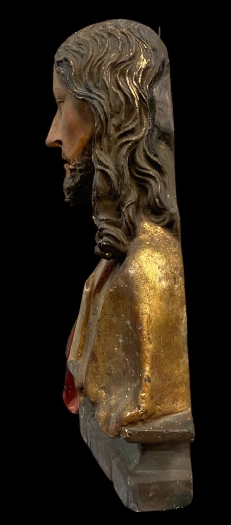Zweite Hälfte 20. Jh. Bemalter, vergoldeter Gips. In gutem Zustand. Mit Spuren früherer Reparaturen.