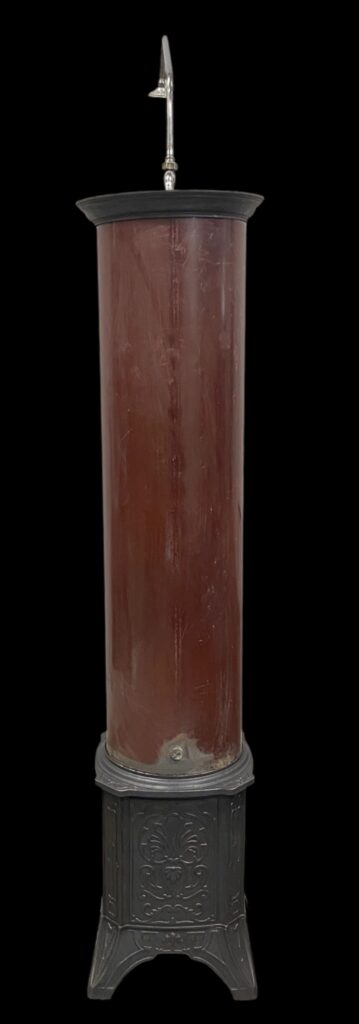um 1900. Zerlegbar, auf gusseisernem Sockel, mit glattflächigem Kupfertank, vernickelter Messingleitung und Armatur. In schönem, gereinigtem Zustand.