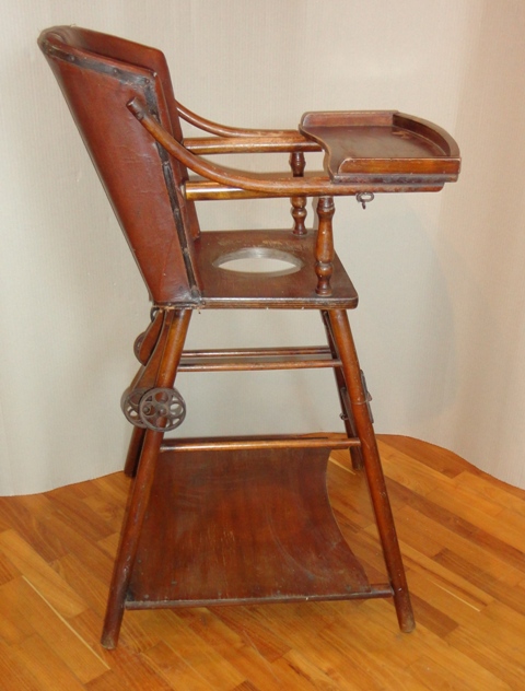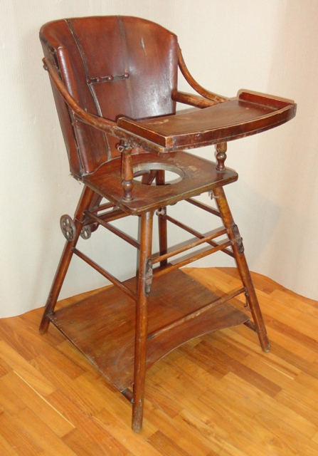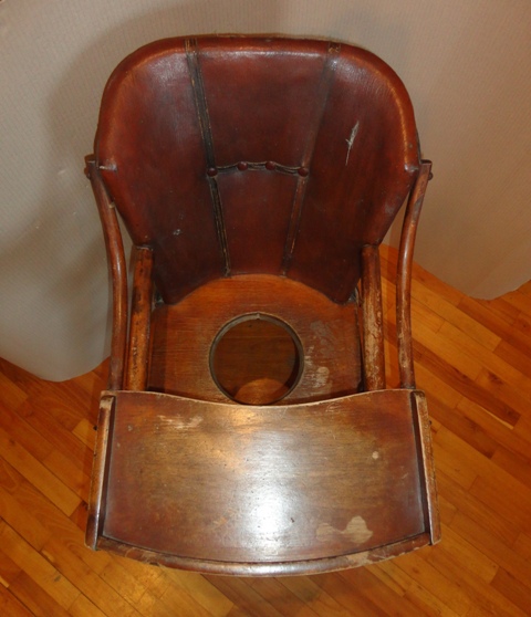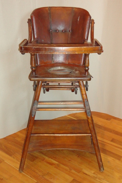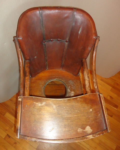 Kinder Hochstuhl: um 1900. Thonet Art, mit Leder Bedeckung. Essbrett ist verstellbar, kann auseinander gesetzt werden und zu einem kleinen Auto aufgebaut werden. Zustand: original, schön, gereinigt, betriebsbereit, mit Patina.