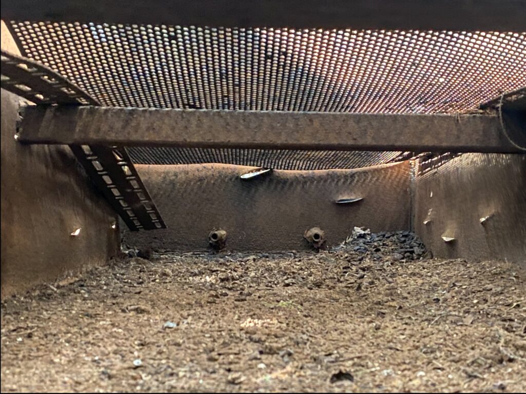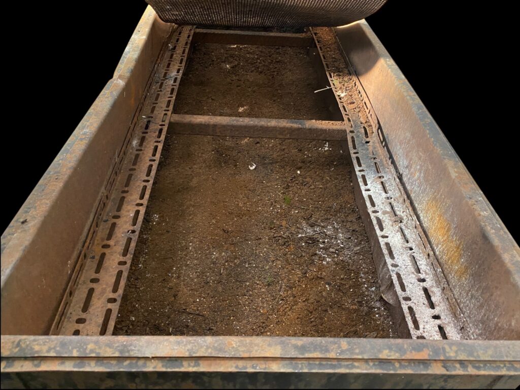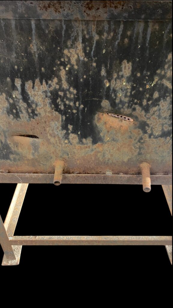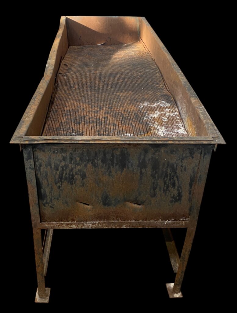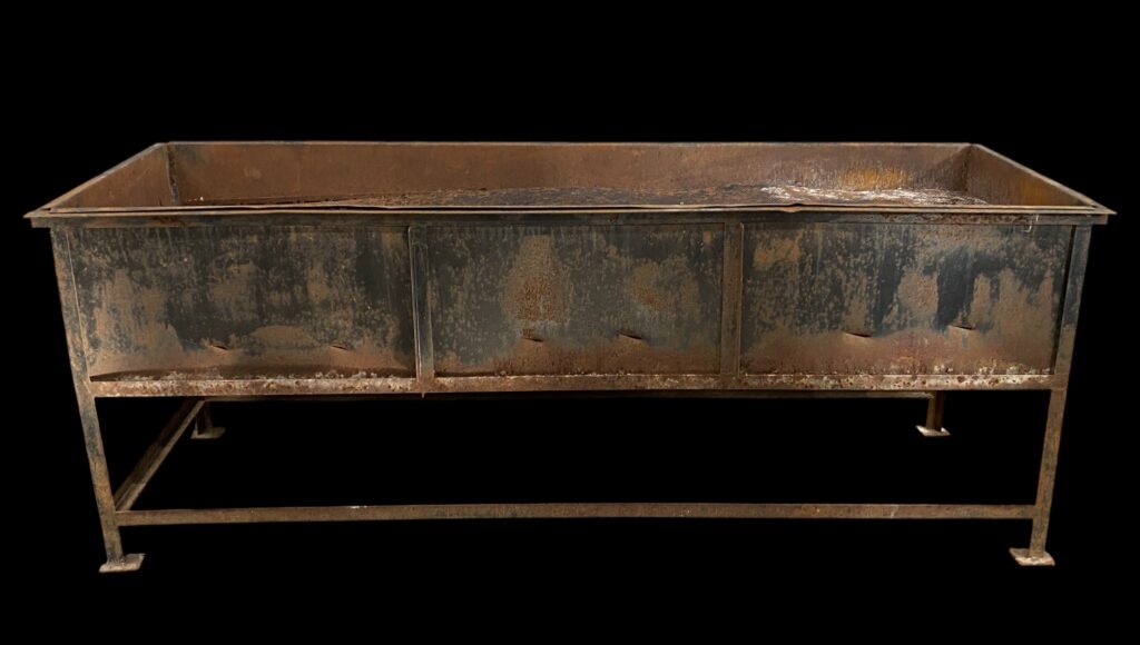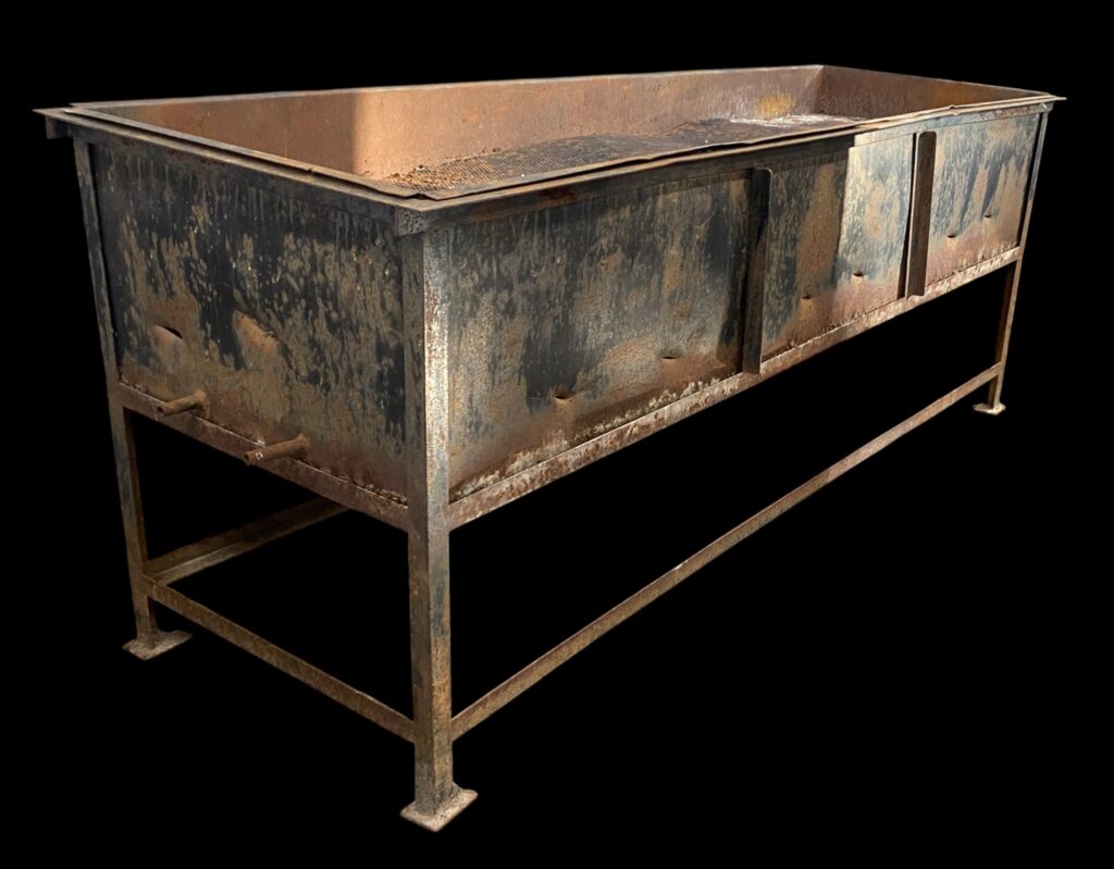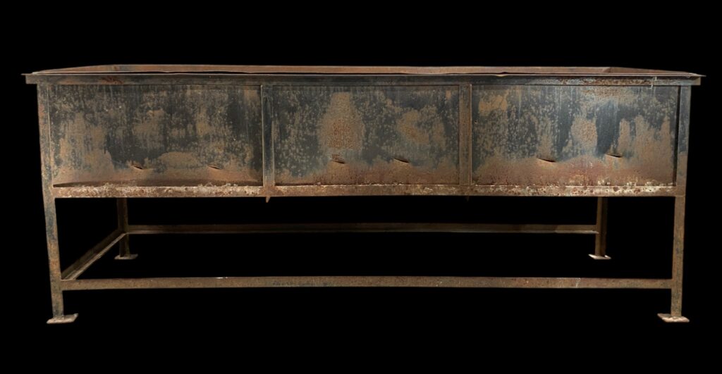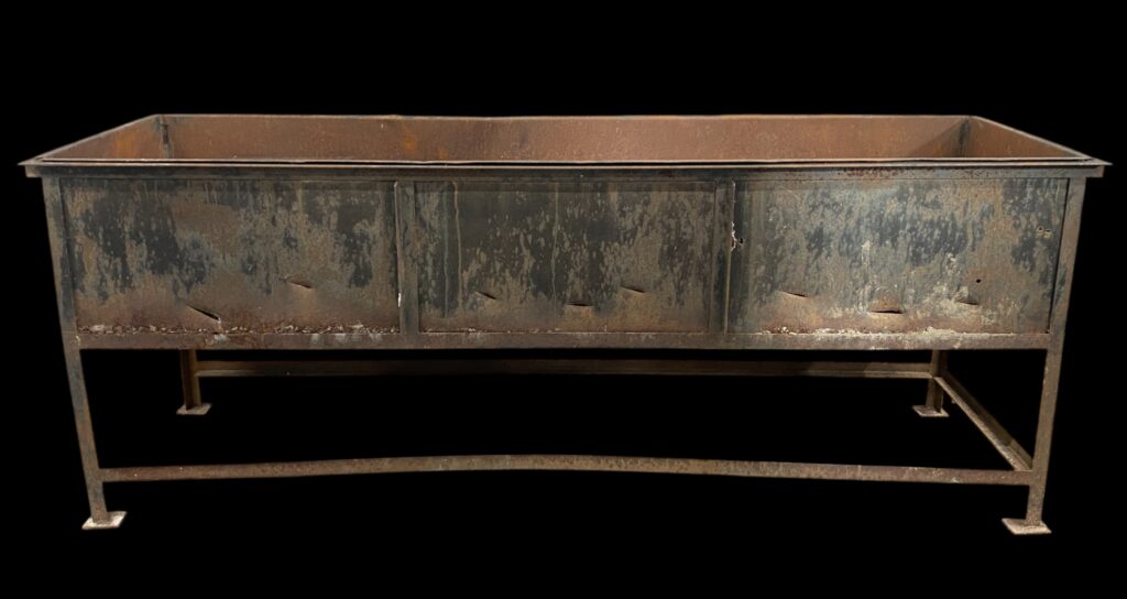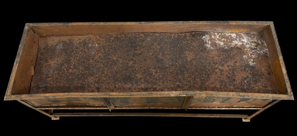 20. Jahrhundert. Auf Stahlbeinen mit Seitenwänden. Mit innenliegendem perforiertem Rost. Lebensnahe, patinierte Optik mit einigen Beschädigungen.