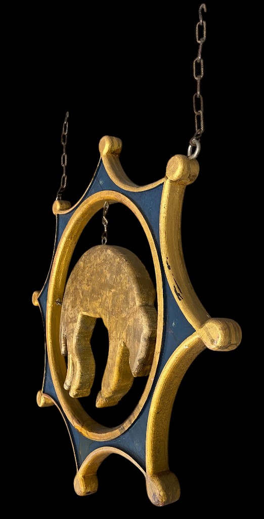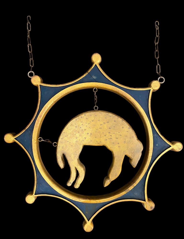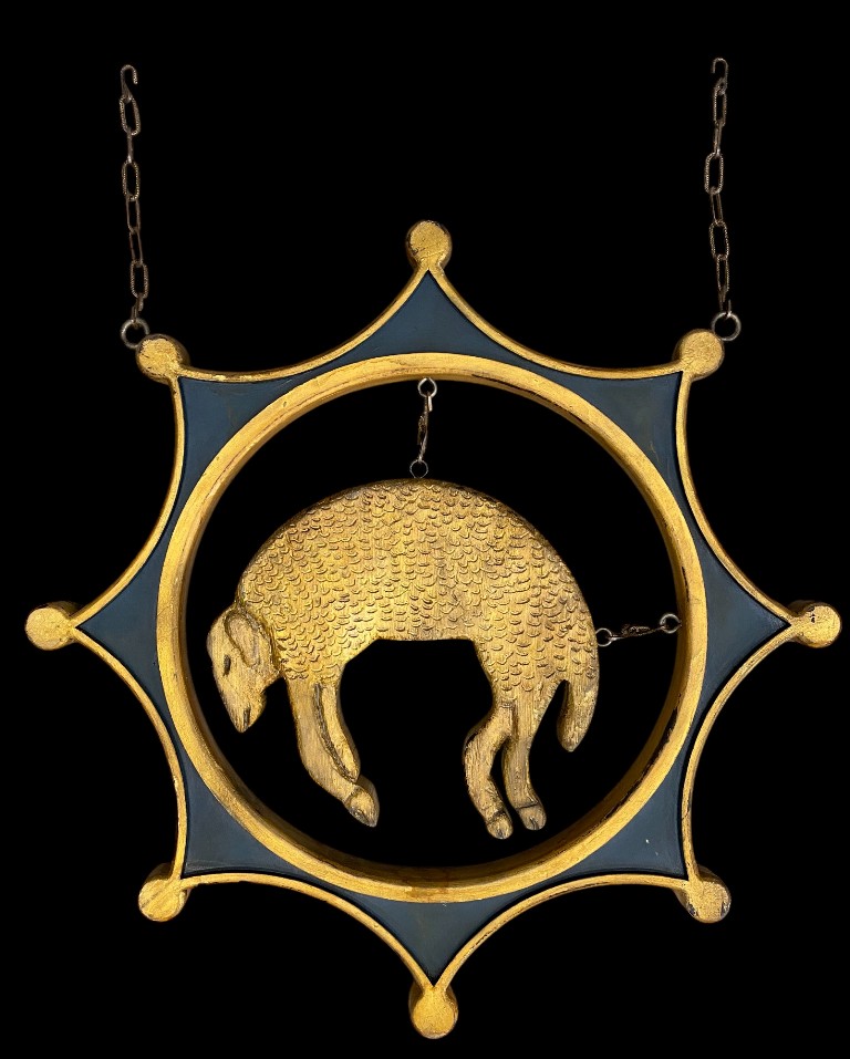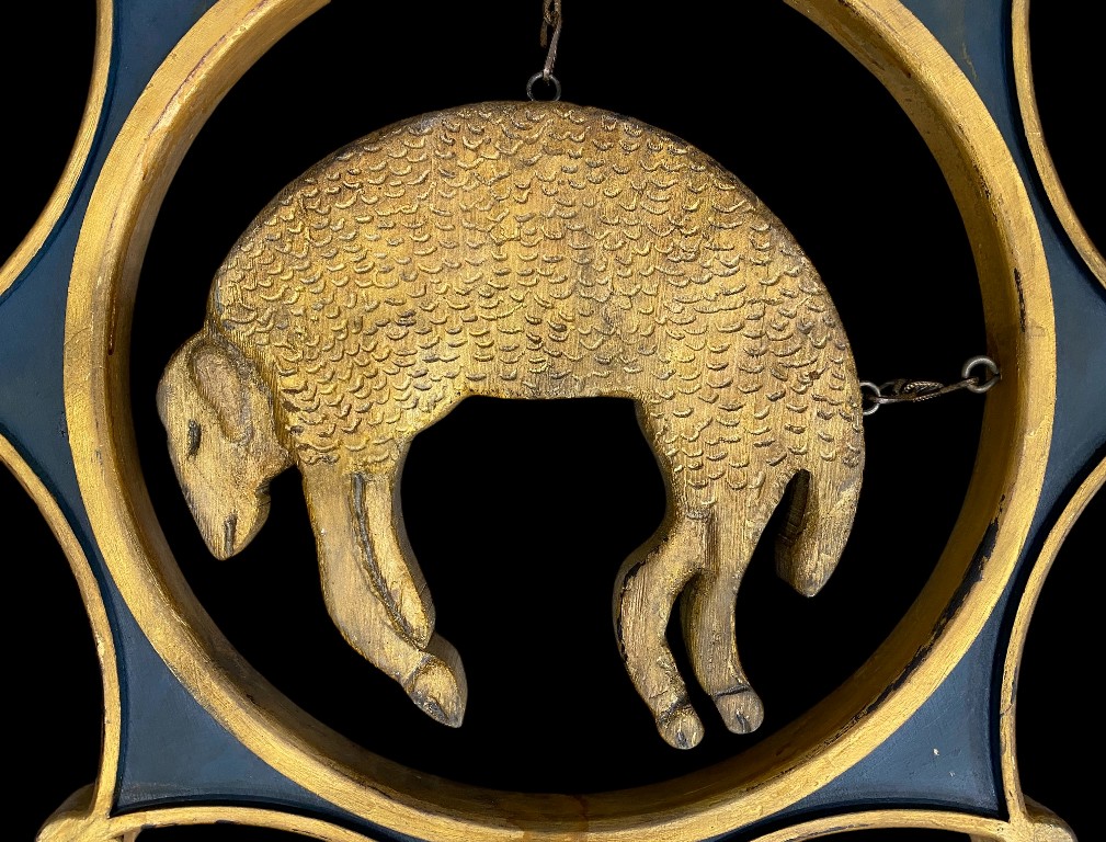 Neu angefertigt. Geschnitztes Holz mit innerer Darstellung eines Lamms. In gutem Zustand.