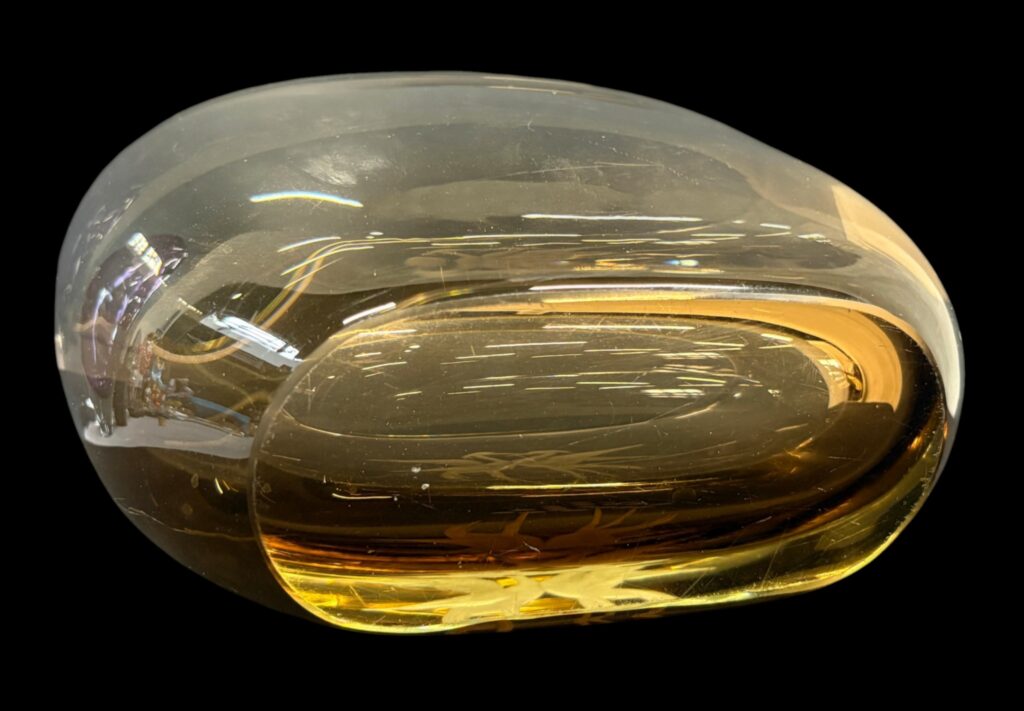 Farblos–bernsteinfarben und beige verlaufendes geblasenes Glas mit geschliffenem Dekor. In schönem Zustand.