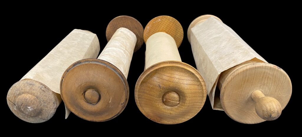 Gedrechseltes Holz, Papier, mit Lederriemenbindung. Patiniert, in gutem Zustand.