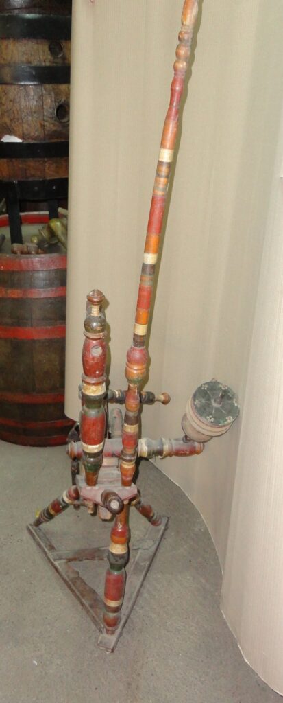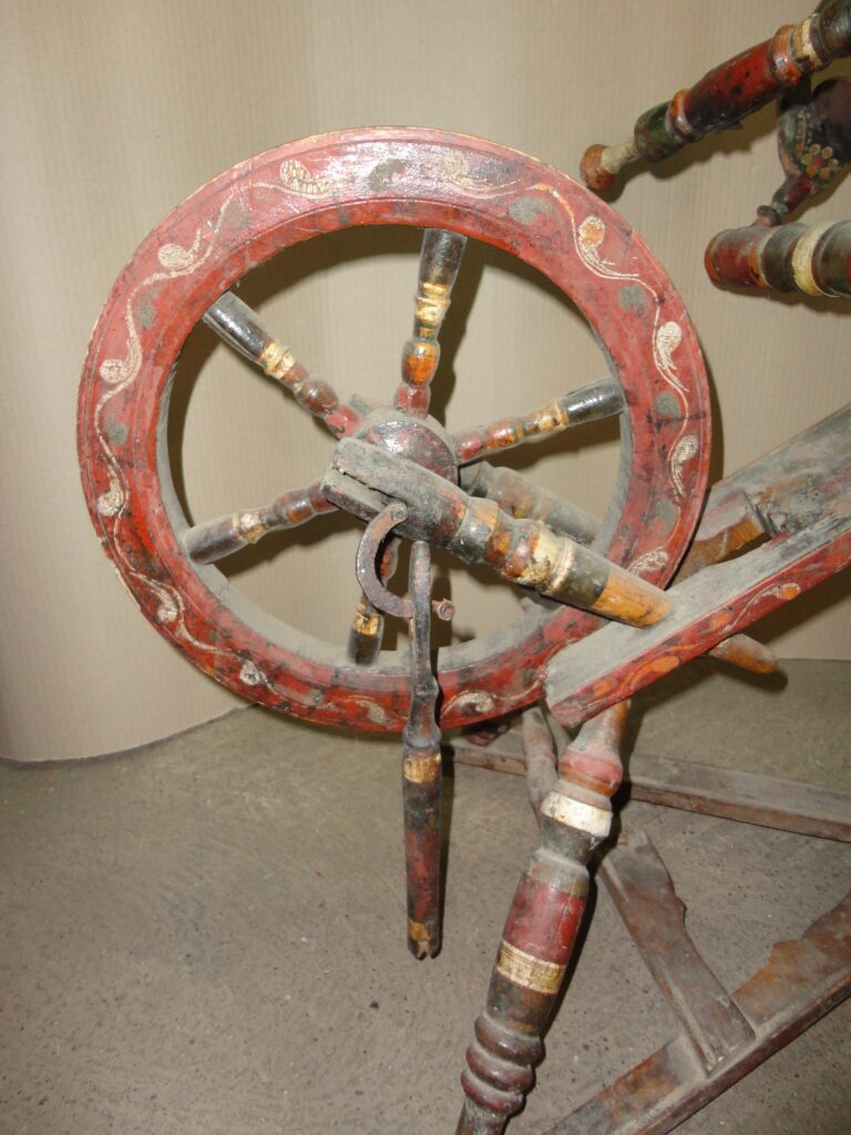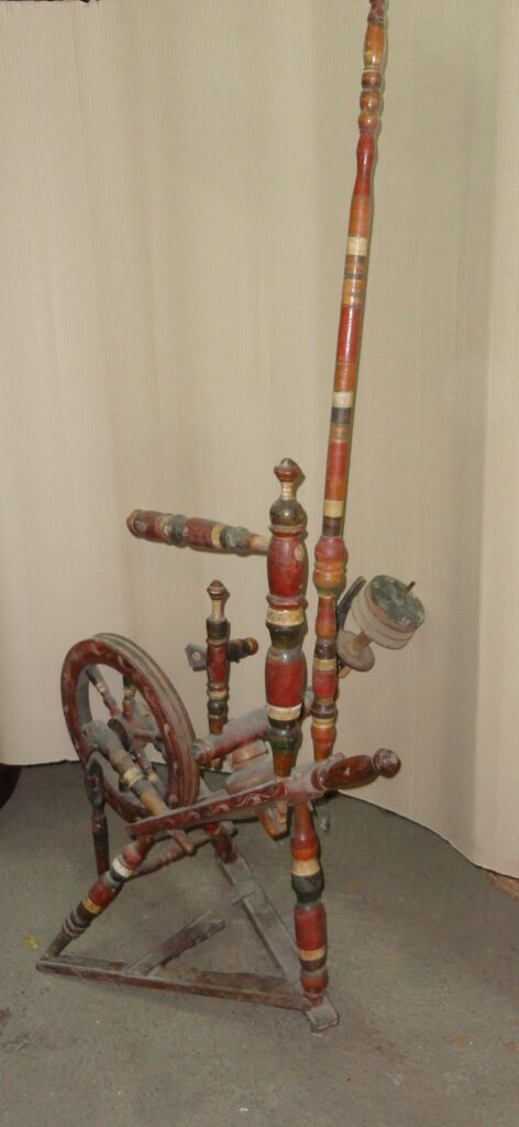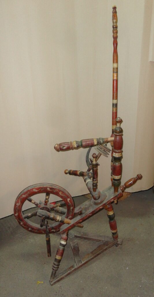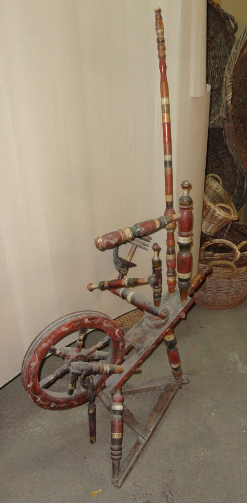 Rotes Spinnrad: Ende des 19. - Anfang des 20. Jahrhunderts. Holz mit bemalten Mustern. Größe: 140×76×44 cm
