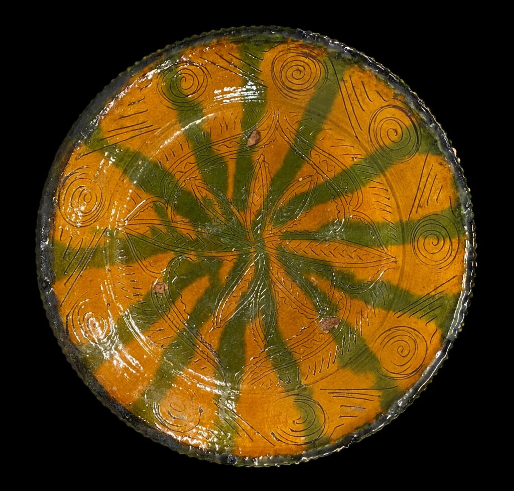 Schale mit ockergelbem Grund, grünen Streifen und eingeritztem Muster d=43 cm
