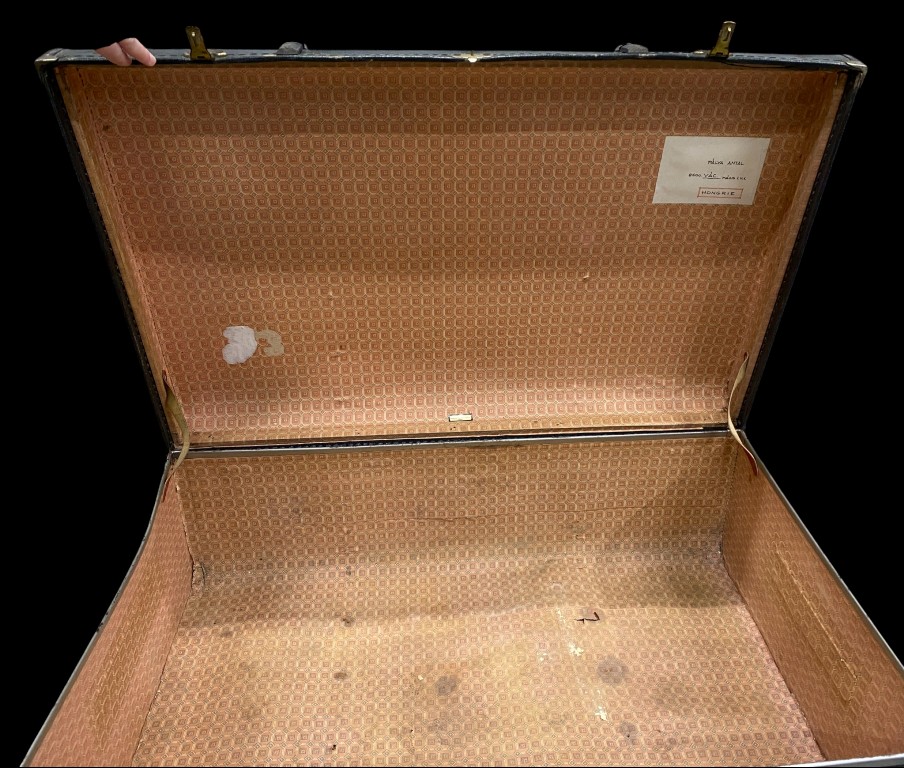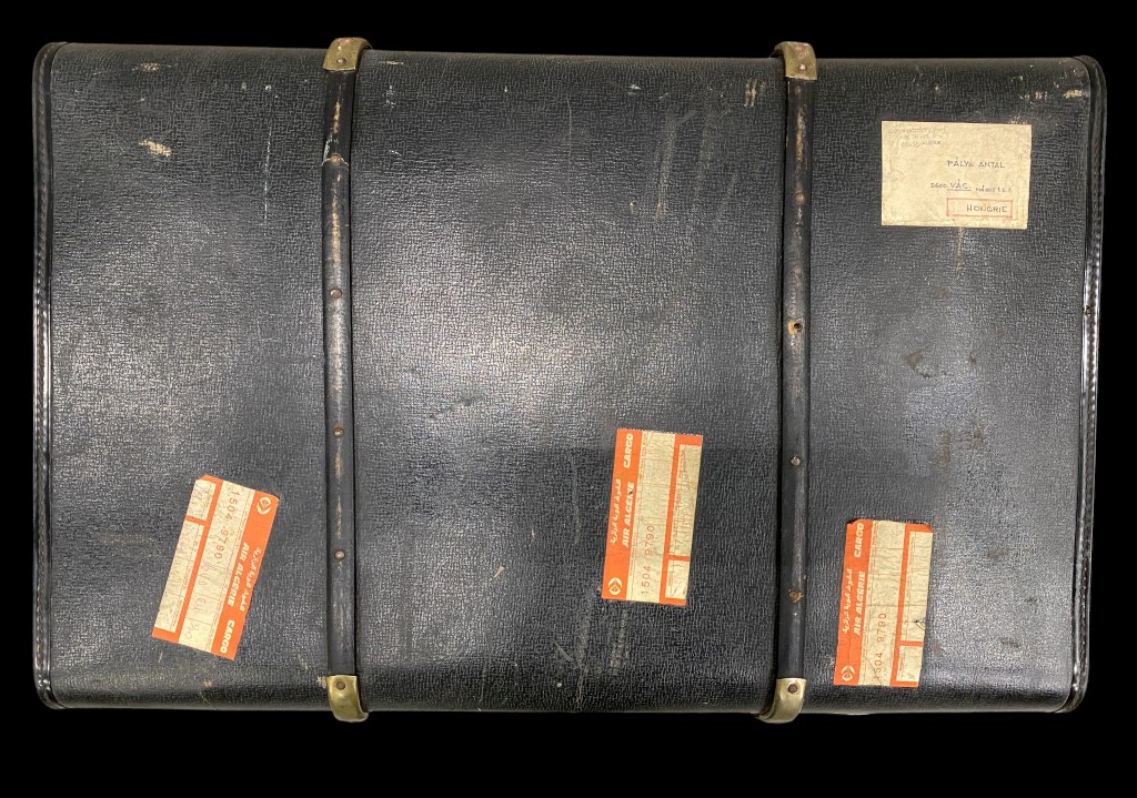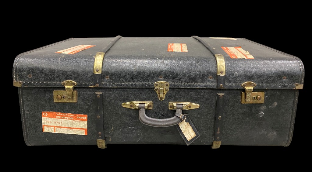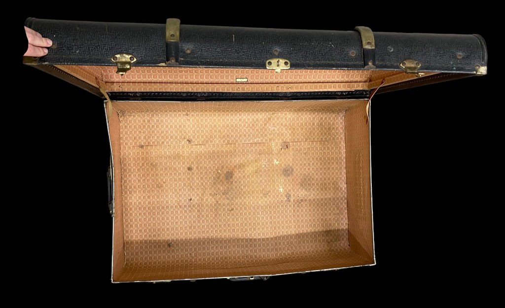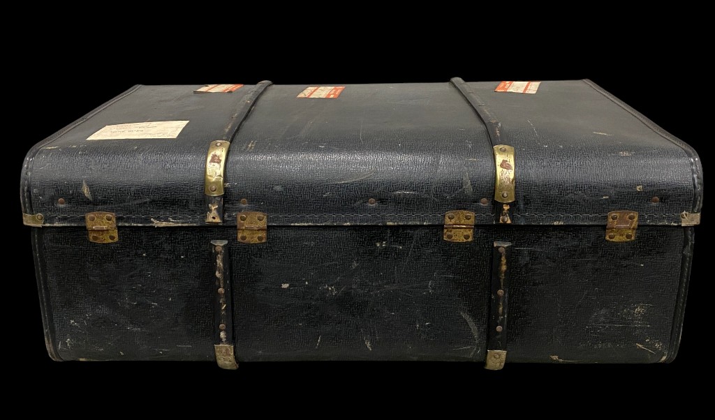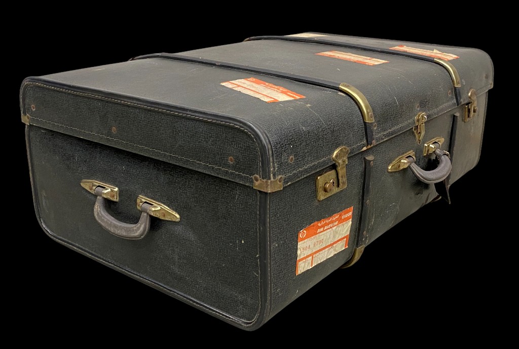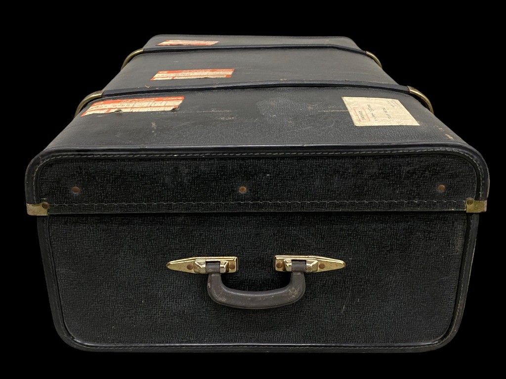 Schwarzer Koffer mit Riemen und Messingschnallen