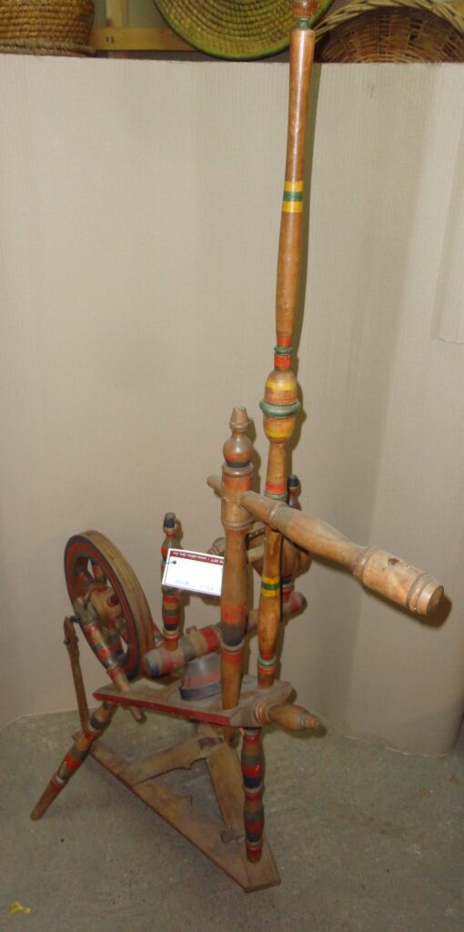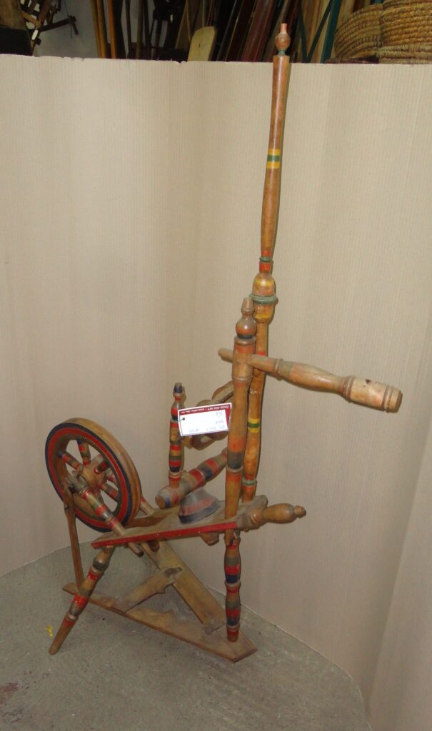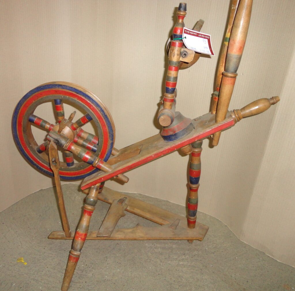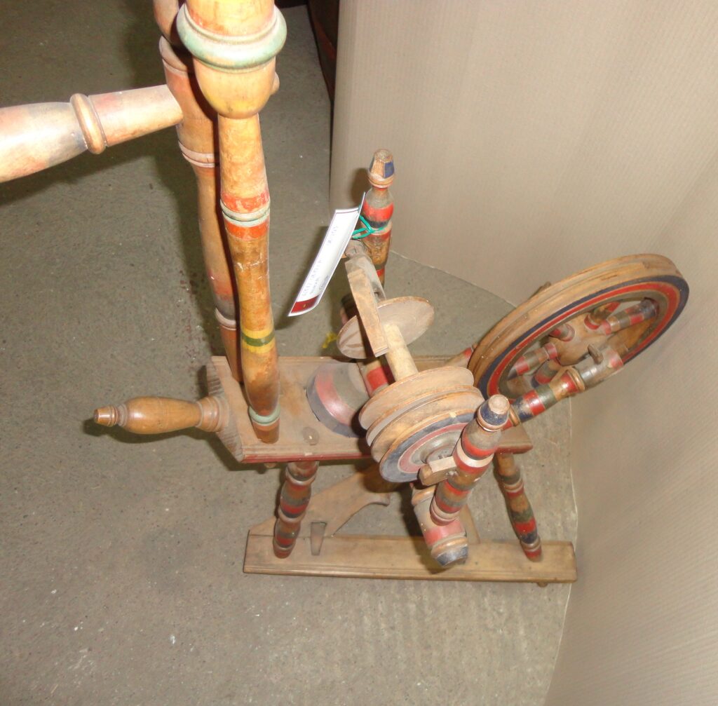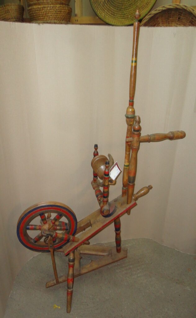 Spinnrad: Ende des 19. - Anfang des 20. Jahrhundets. Holz, farbig, mit bemalten Mustern. Größe: 125×70×40 cm