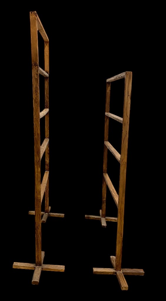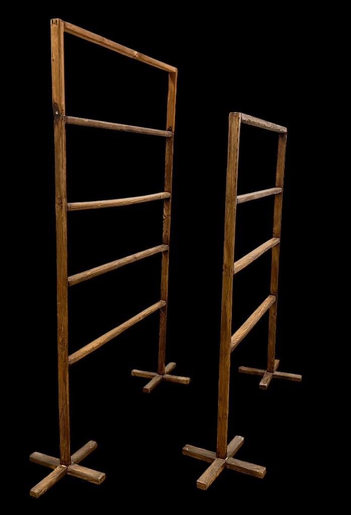 Stoffständer: Gebeiztes, gealtertes massives Kiefernholz. Patiniert, lebensecht, in gutem Zustand. 4-stäbig: Maße: 153 x 139 x 40 cm 5-stäbig: Maße: 166 x 139 x 40 cm
