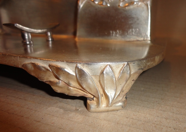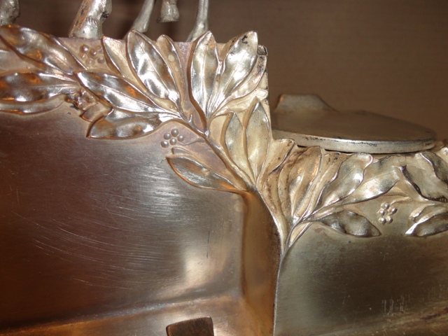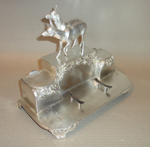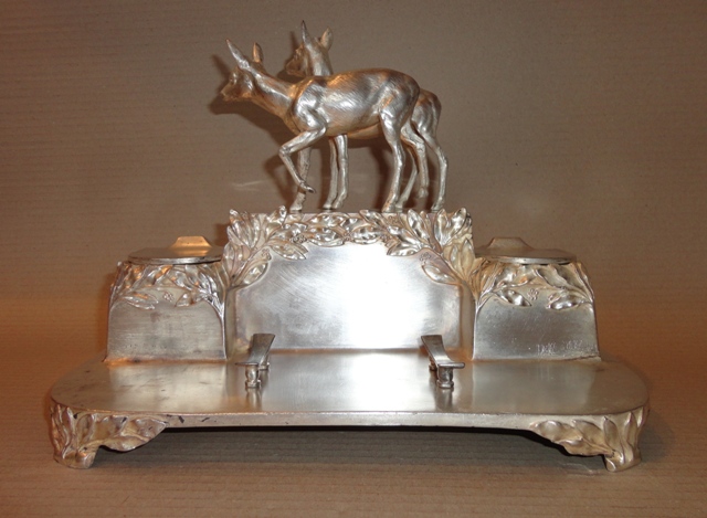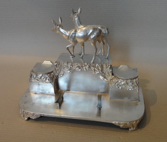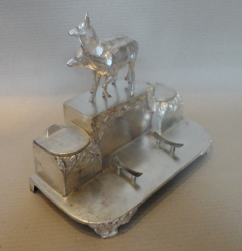 Tinte Halter: um 1900. Versilbertes Zinn, stellt Rehe vor, mit Lorbeerblatt Dekoration. Original Zustand mit Patina. Größe: 22×30×16 cm