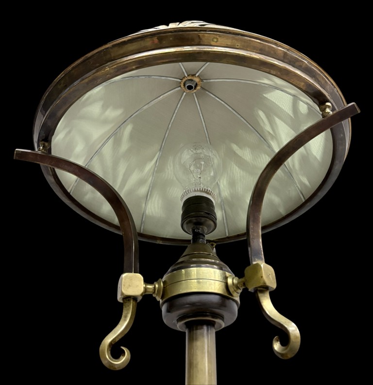 Erste Hälfte des 20. Jahrhunderts. Messing mit grünem Seidenschirmeinsatz. Funktionsfähig, in gutem Zustand.