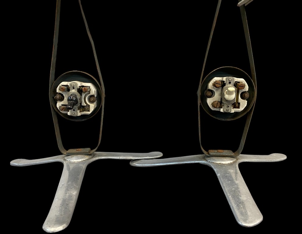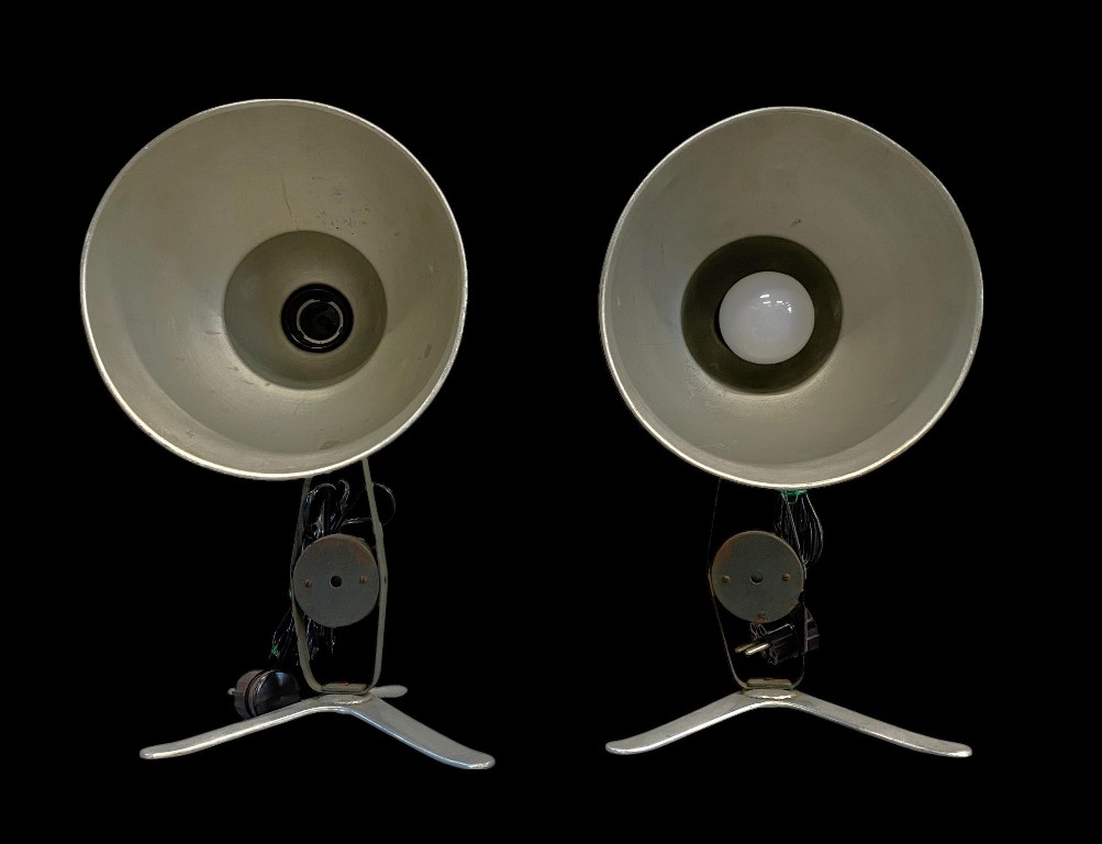 Ca. 1940-50. Aluminiumfuß und Schirm. Lackierter Stahlstab. Alte Verkabelung, aber funktionstüchtig. E27-Fassung.