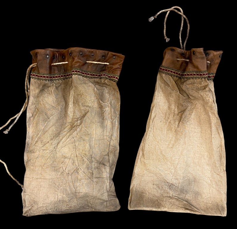 Canvas material with leather edging and gilded burgundy braid. Good condition.