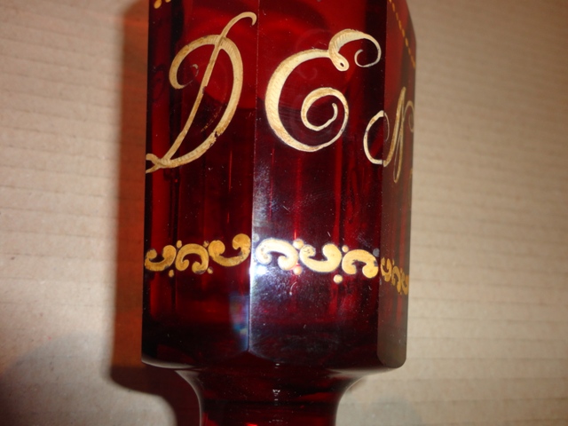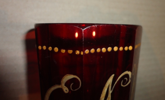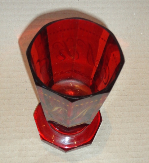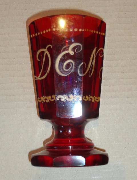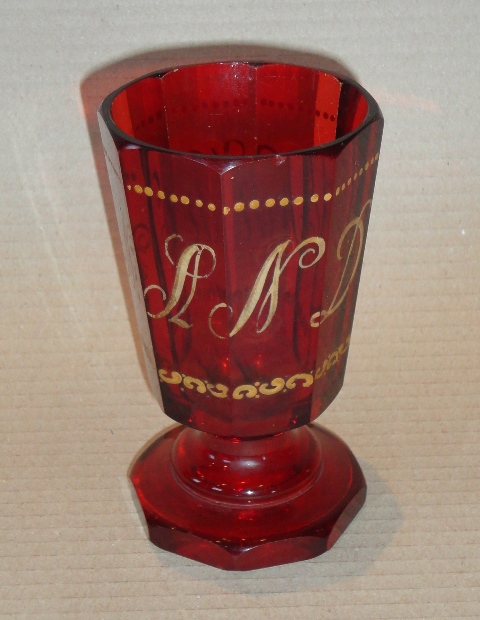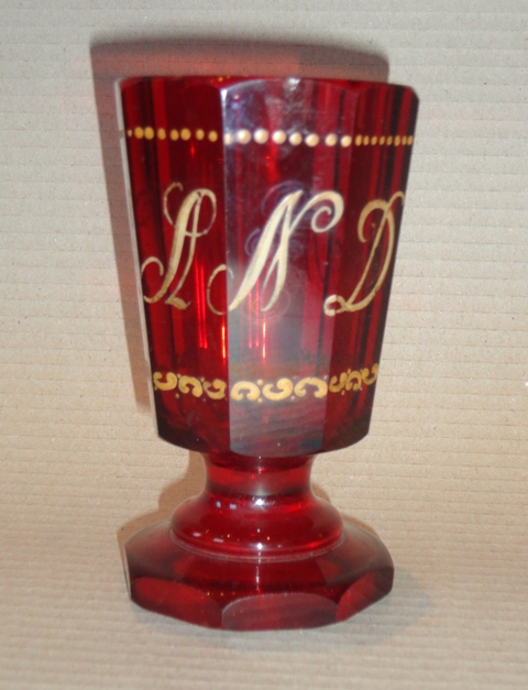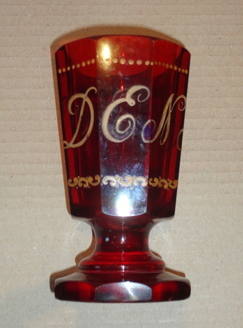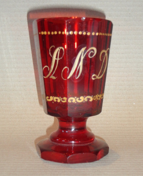 Bieder glass cup: c. 1840. Ruby stained glass, labelled ANDENKEN (memory). In original condition, with patina. Size: 13 cm tall, d=4 cm
