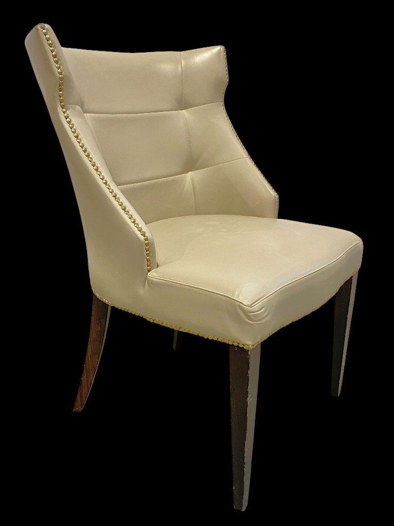 On varnished brown wooden frame, with cream-colored artificial leather upholstery. Used, in good condition.