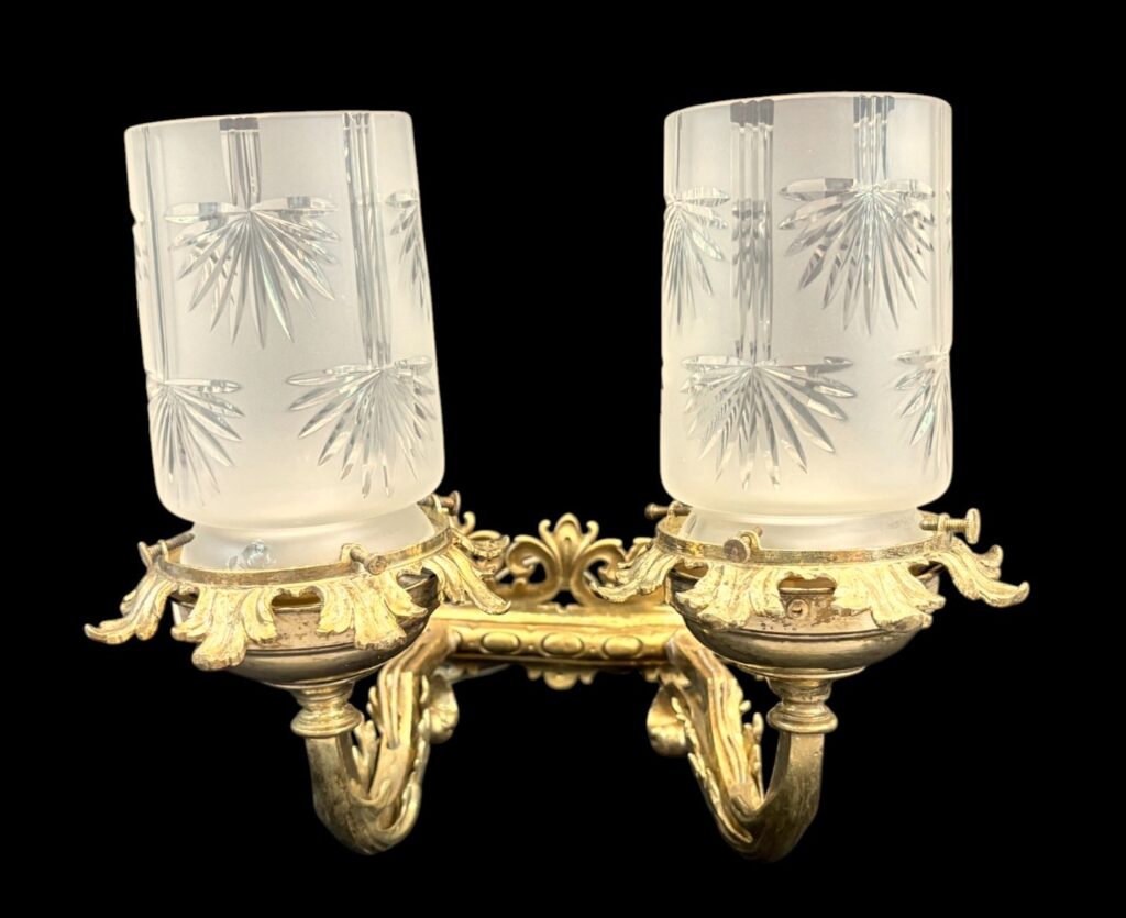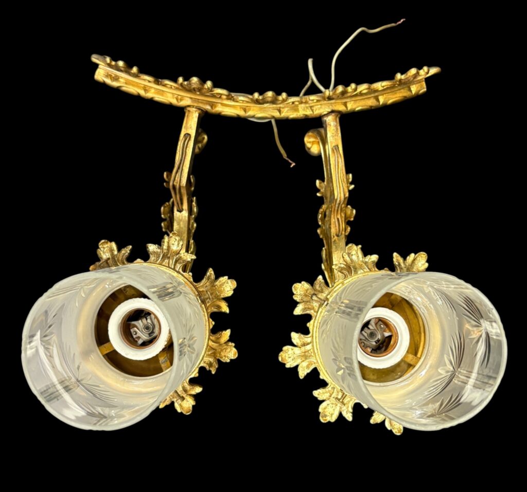 Around 1920. Gilded cast brass with cut glass shade. In good condition.
