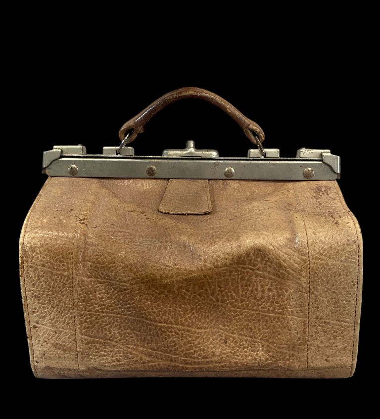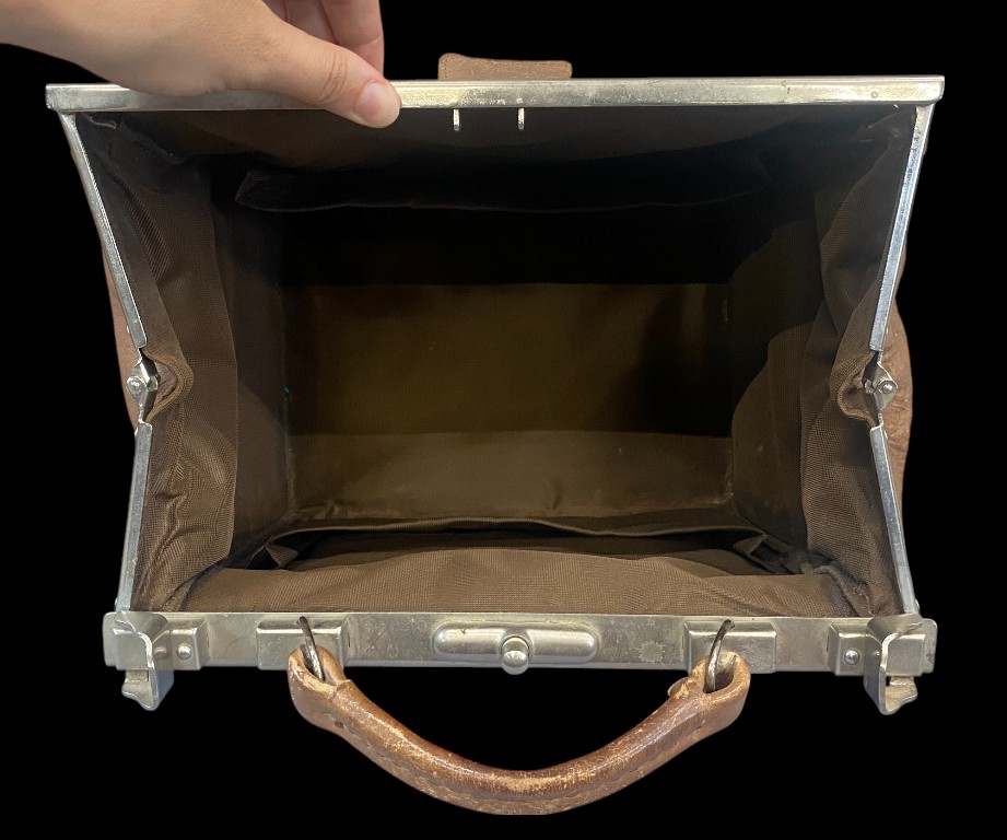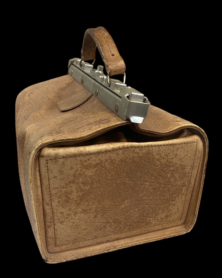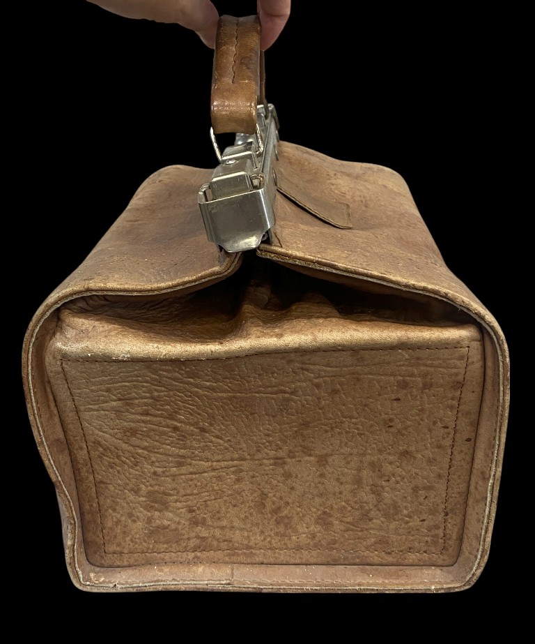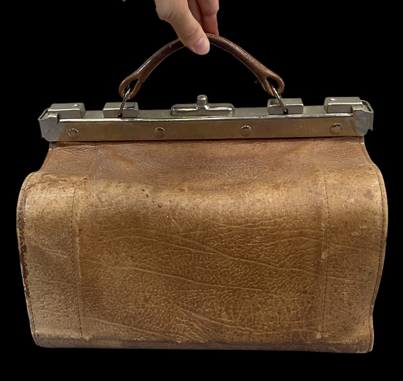 Early 20th century. Leather with nickel-plated metal rim and buckle. In good condition.