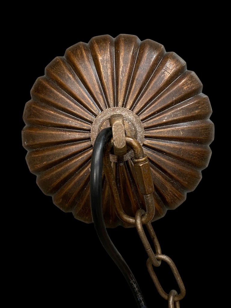 Steel chain suspension. One has a missing canopy. Inside with 3-bulb E14 socket.