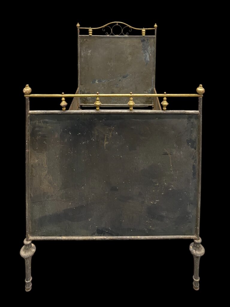 Circa 1910–20. On cast iron legs, steel tube frame with sheet insert. Single bed. Patinated but in good condition. Disassemblable!