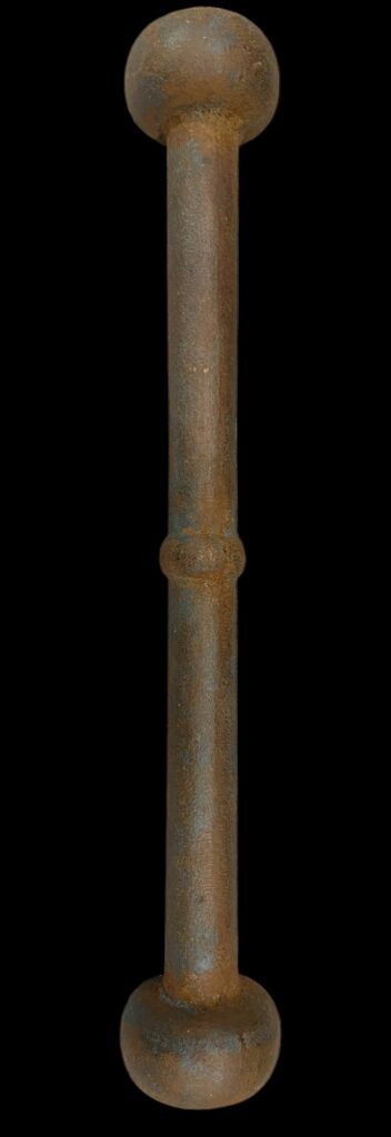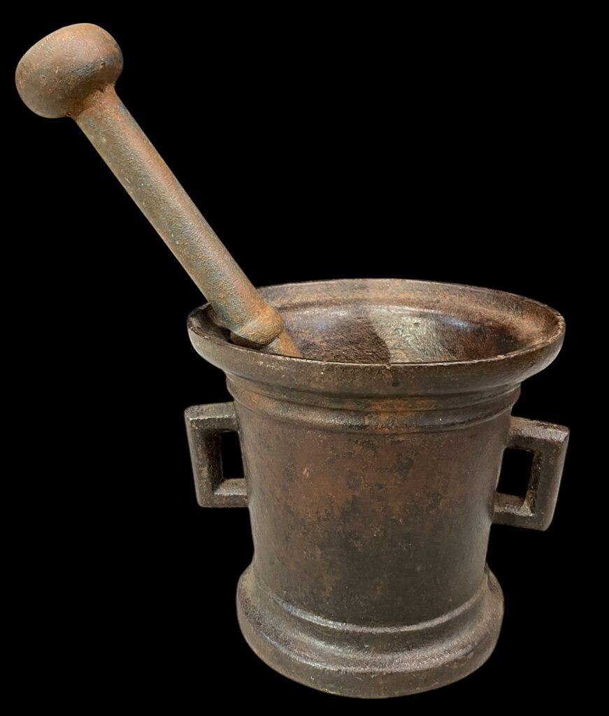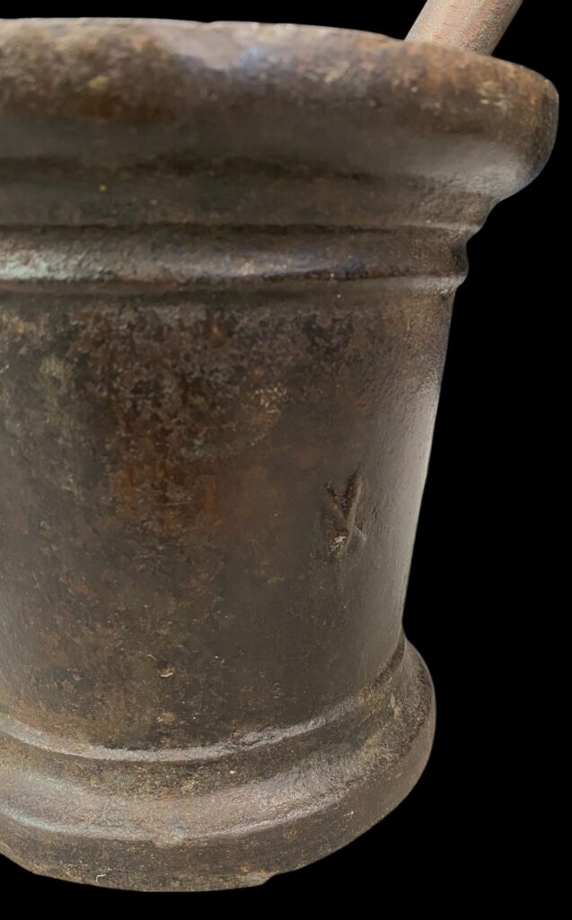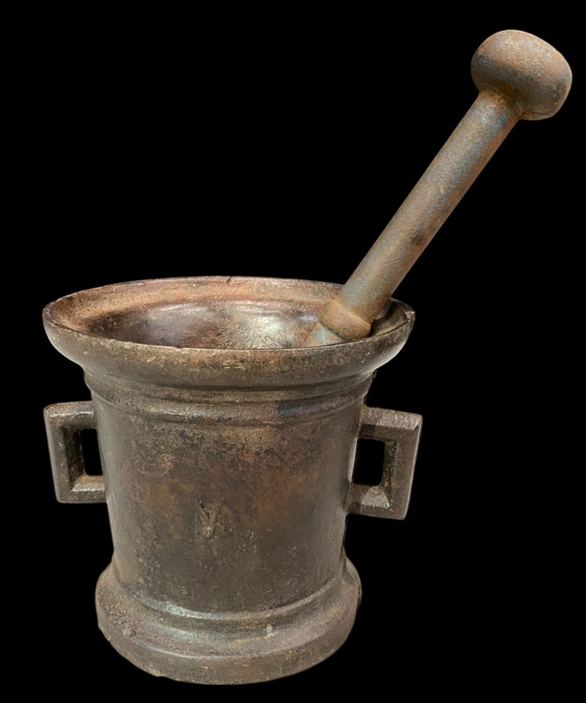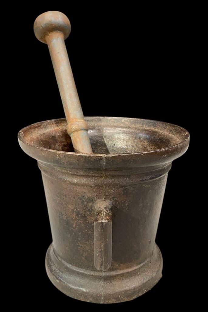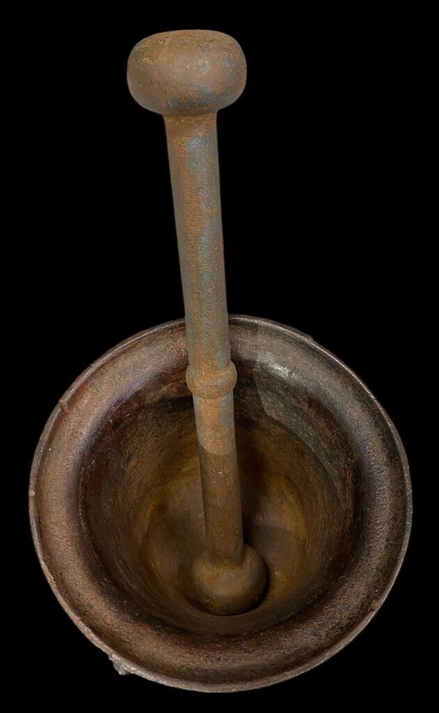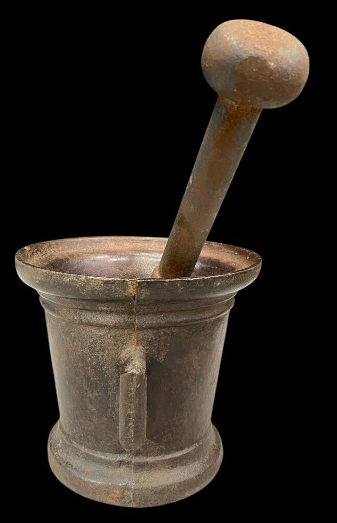 Iron mortar with pestle: early 19th c. Good condition. Size: 15,5 x 18 x 17 cm; pestle: 30 cm