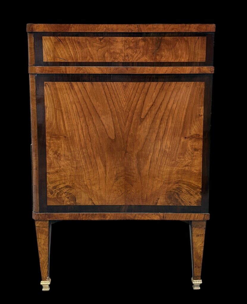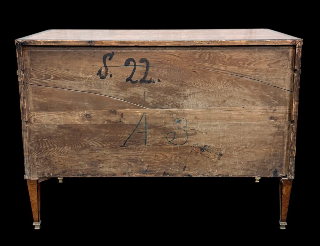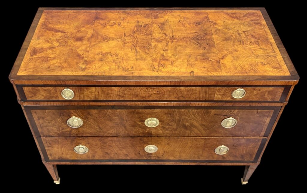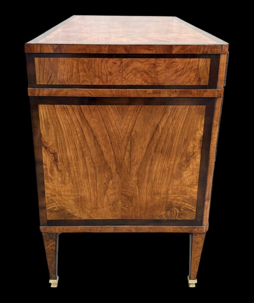 Between 1780–1800. Vienna. Oak base with figured ash veneer. With a darker, wide border. Fire-gilded bronze mounts and handles. Unrestored, only cleaned, in original condition.