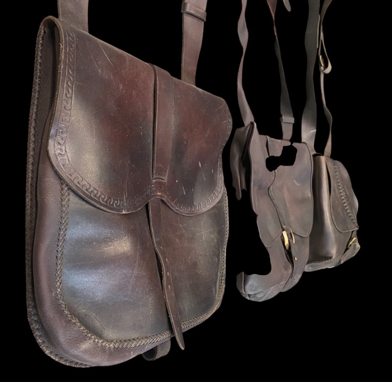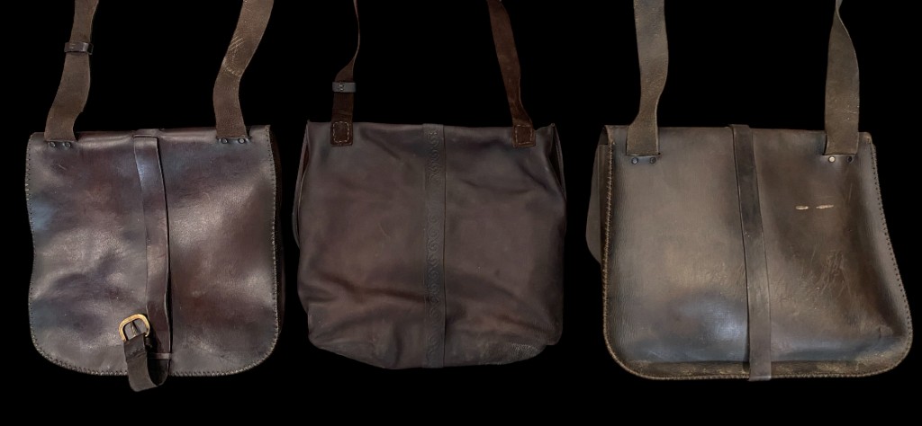 Dark brown leather. Slightly different from each other. Good condition.