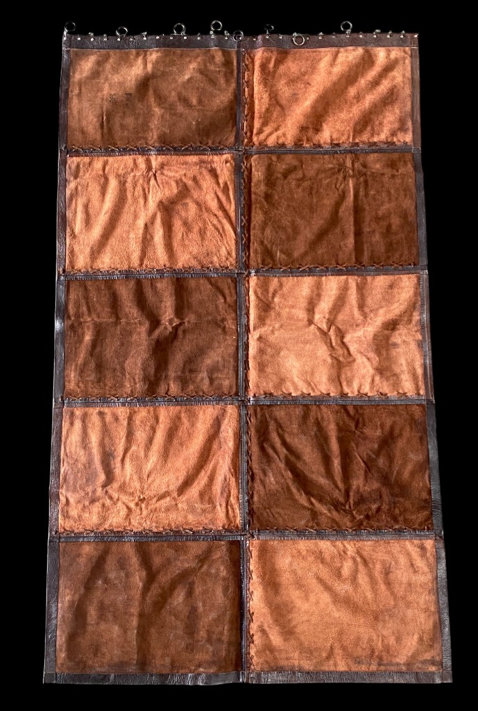 Made of rectangular leather panels with cross-stitch seam imitation. Good condition.
