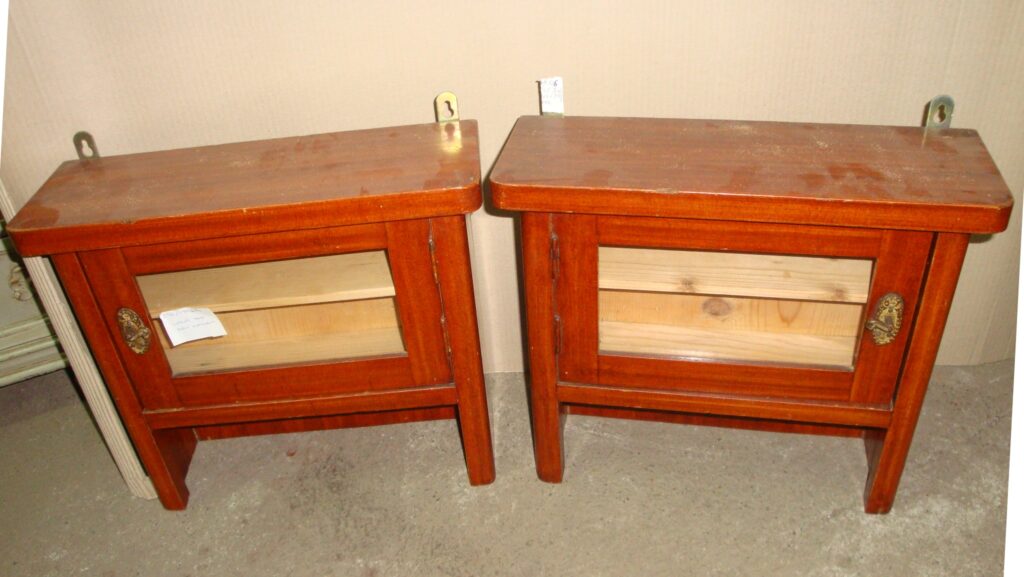 Mahogany veneered wall cabinet pair: Beginning of 20th c. Pine wall cabinet pair, with glassed doors, with mahogany veneer, in cleaned condition.