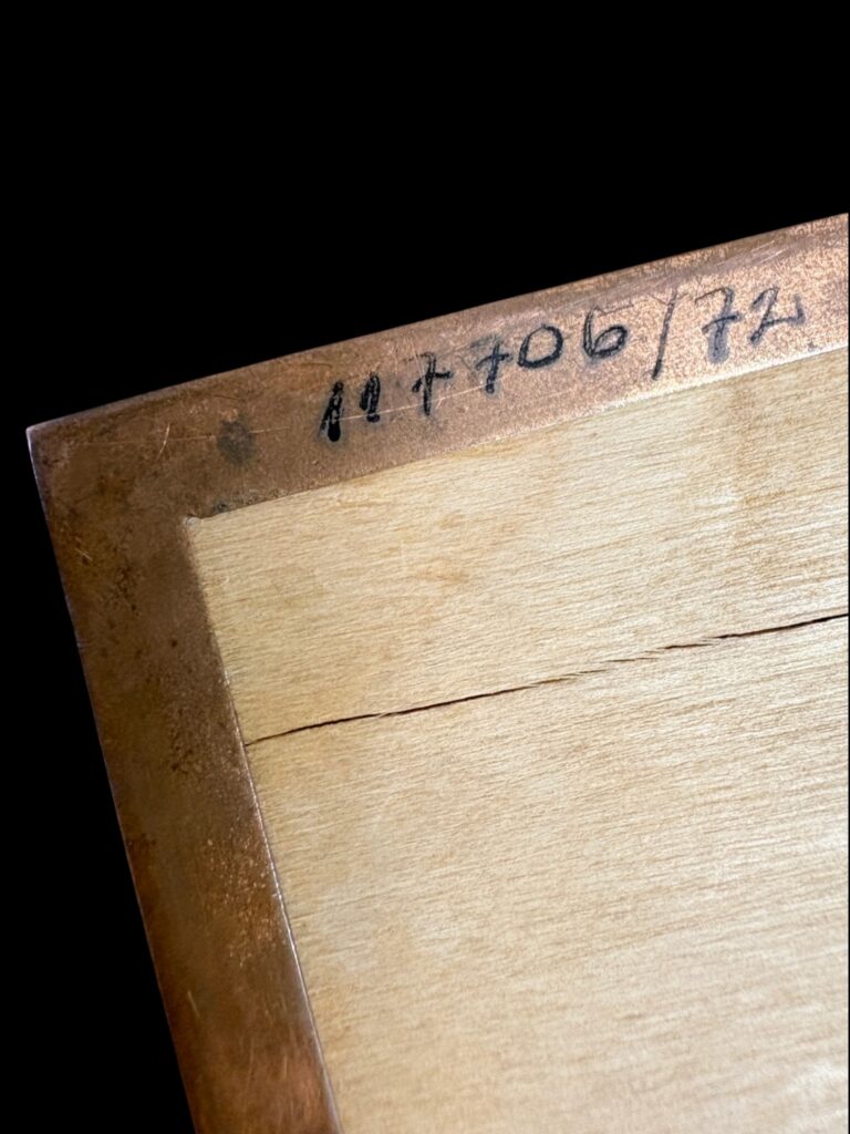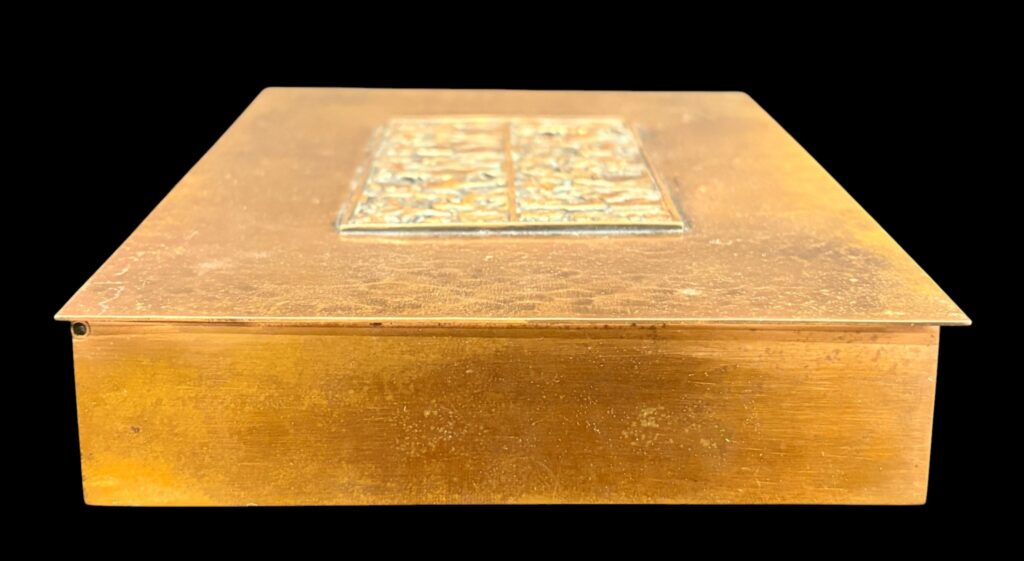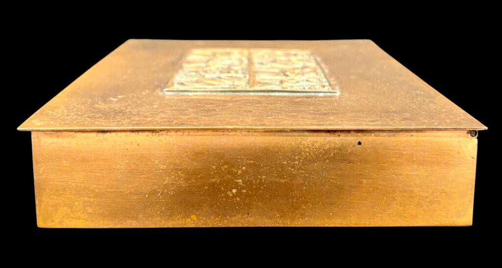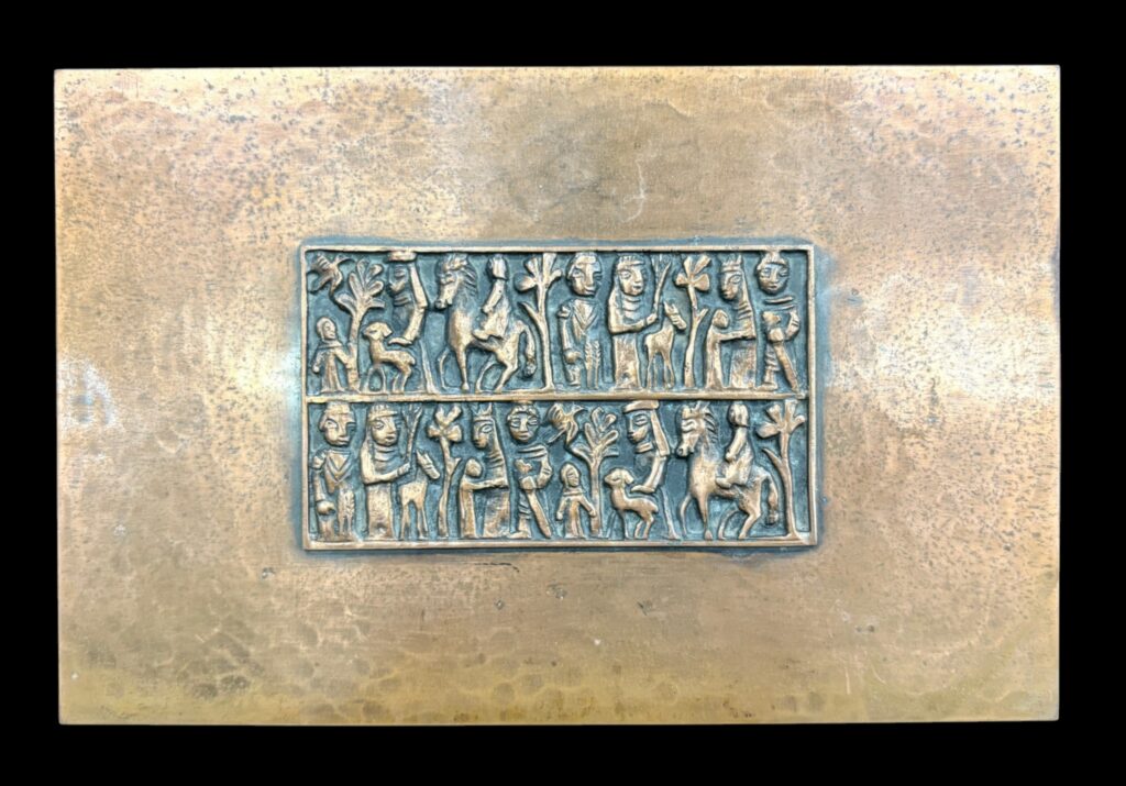 (1901, Békéscsaba – 1978, Budapest). Around mid-20th century. Hammered metal sheet with copper-coated cast appliqué featuring relief-like figurative decoration. Marked on the base: “Tevan”. In original, cleaned condition.