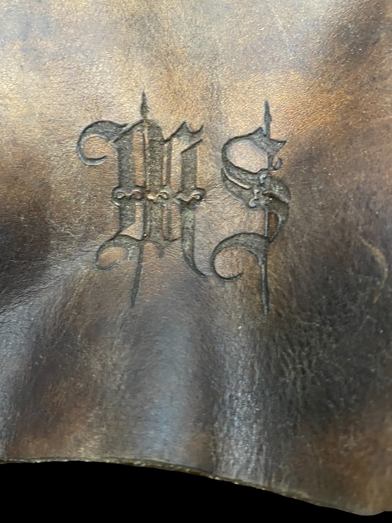 MS monogrammed leather side bag with stitched edges