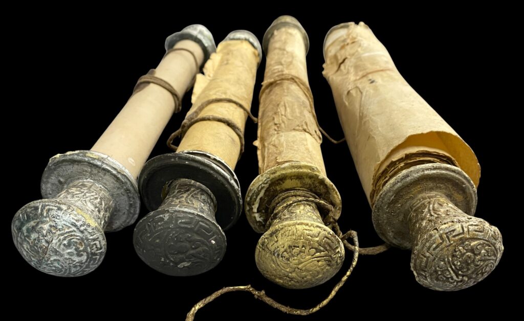With metal-effect knob ends, paper, and leather strap binding. Patinated, in good condition.