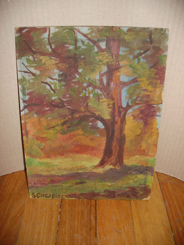 Schweiger: Woods: Technic: oil paint, fibreboard. Signed in bottom left corner: SCHWEIGER. Size without frame: 24×18 cm